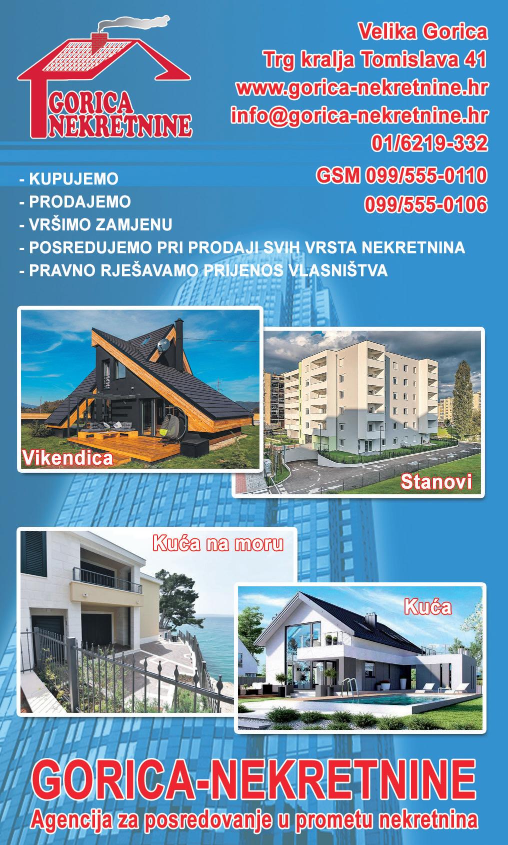 Velika Gorica, Čret Posavski, samost. kuća katnica površine 300 m2 i okućnice od 2872 m2 koja se sastoji od prizemlja (ulaznog dijela, hodnika, kupaonice, ostave, 3 spavaće sobe, kuhinje sa blagovaonom te dnevnog boravka sa izlazom na natkrivenu terasu), kata (roh-bau isti raspored- te velike trase koja se proteže iznad dvije garaže) i potkrovlja (roh-bau). Na parceli se također nalazi i ograđeni vrt, voćnjak i plastenik. Posjeduje Rješenje o izvedenom stanju. 210.000 € www. gorica-nekretnine.hr 099 555 0106 Velika Gorica, Rakitovec, kuća katnica površine 160 m2 i ograđene okućnice od 250 m. Kuća se sastoji od: prizemlja (dnevni boravak sa blagovaonicom te izlazom na terasu, kuhinje, kupaonice i ostave), kata – iz kojeg je izlaz na veliki balkon (3 spavaće sobe iz koje jedna ima izlaz na balkon i kupaonice) i potkrovlja (roh-bau). U dvorišnom dijelu nalazi se pomoćni objekt u kojem je smještena kotlovnica i garaža u koju stanu 2 automobila. 155.000 € www.gorica-nekretnine.hr 099 555 0106