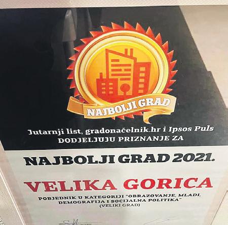 a svečanom proglašenju najboljih gradova za 2021. u organizaciji Jutarnjeg lista, portala Gradonačelnik.hr i agencije Ipsos u Novom Vinodolskom, Velika Gorica je izabrana za najbolji veliki grad u kategoriji "Demografija, obrazovanje, mladi i socijalna politika". Plasman je zaslužila nizom projekata i mjera kojima je podignut standard. Nalazi se u Top 5 po iznosu porodiljine naknade po novorođenom djetetu (3.283,63 kn) i po broju odgojitelja u vrtićima u kategoriji velikih gradova (5,44 djece po odgojitelju), u Top 10 je po izdvajanjima za obrazovanje, socijalnu politiku i mlade u proračunu, u istoj kategoriji gradova (46,05 % proračuna), a u Top 20 po iznosu stipendija i školarina po stanovniku (16,03 kuna). Po pitanju kvalitete života Gorica je osigurala peto mjesto po izdvajanjima za sport u proračunu u kategoriji velikih gra-