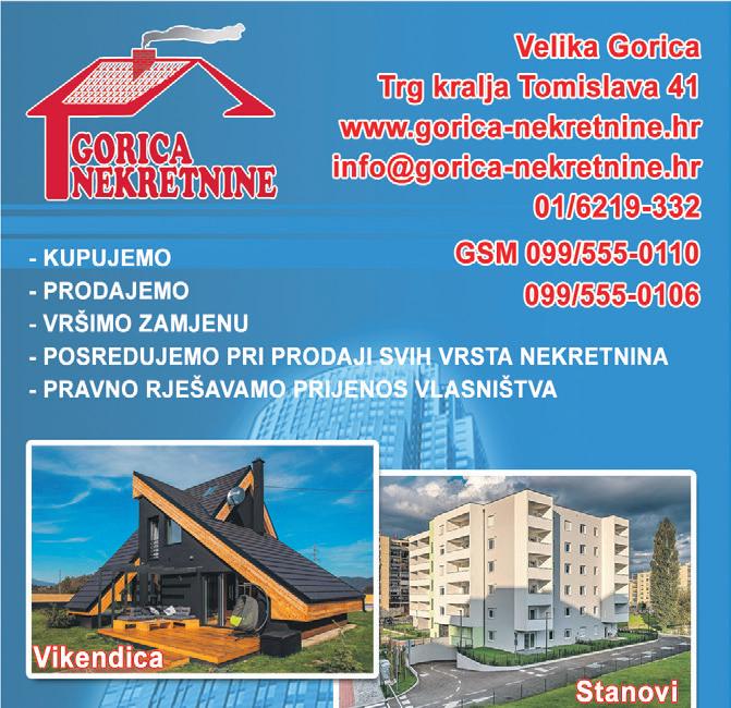 Velika Gorica, Ribnica, samost. v. prizemnica površine 200 m2 i okućnice 1350 m2, sastoji se od podruma i prizemlja, u sklopu kuće je garažno poslovni prostor (visina 4m) 70 m2, 105.000 € www.gorica-nekretnine. hr 105.000 € Velika Gorica, Ribnica, samost. prizemnica (za rušenje ili adaptaciju) površine 65 m2 i okućnice 1238 m2, sastoji se od podruma i prizemlja, 42.000 € www.gorica-nekretnine.hr 099 555 0106