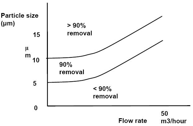 The performance of the unit is material specific and the Siltbuster 50 Series is nominally designed to achieve 90% removal of the +15- micron diameter particles (medium sized silt) at a flow rate of 45m3/hr, +10micron at 20m3/hr and some +6 microns at 5m3/hr. Under normal operating conditions the unit will also r emove a significant proportion of the material in the 2 to 15µm (fine to medium sized silt) range. These are based on average particle densities.