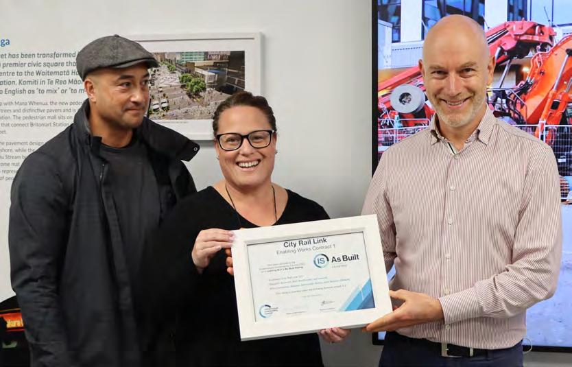 Paora Puru and Josie Wall (Mana Whenua) and Nick Braxton (CRL Ltd) receiving the 'C1 ISC Leading As Built Rating' award