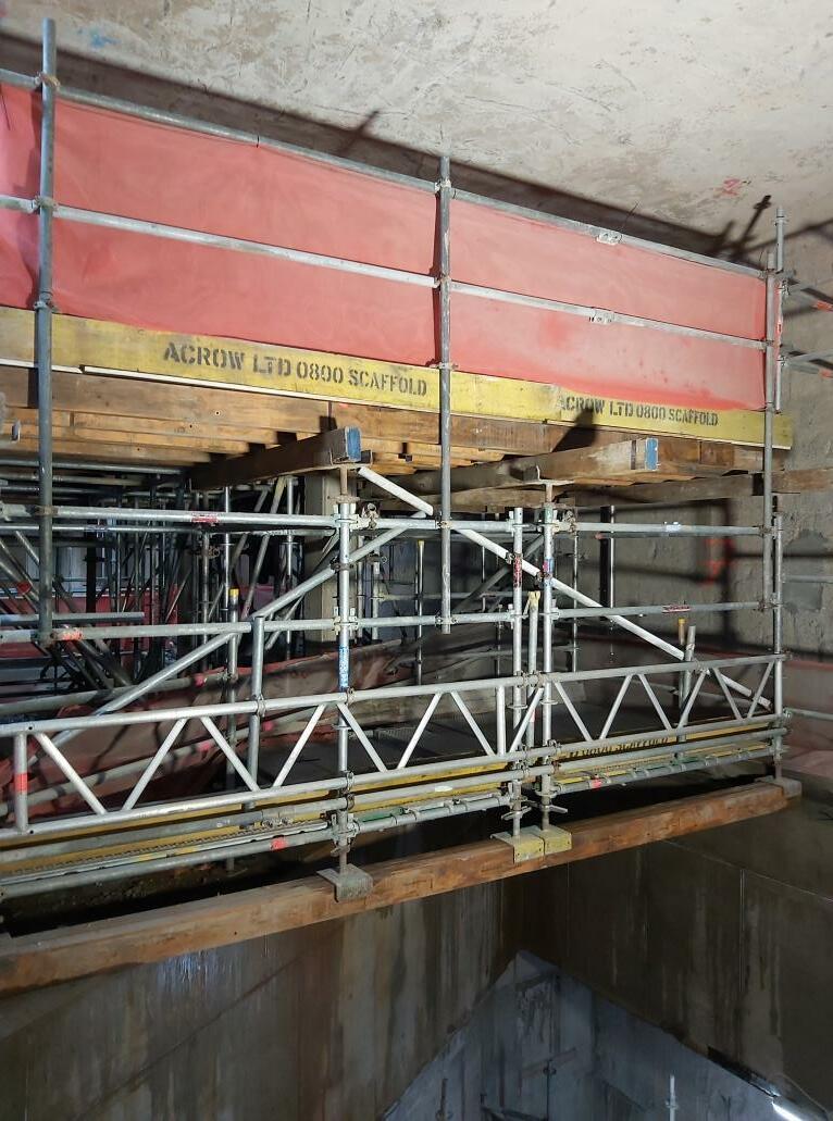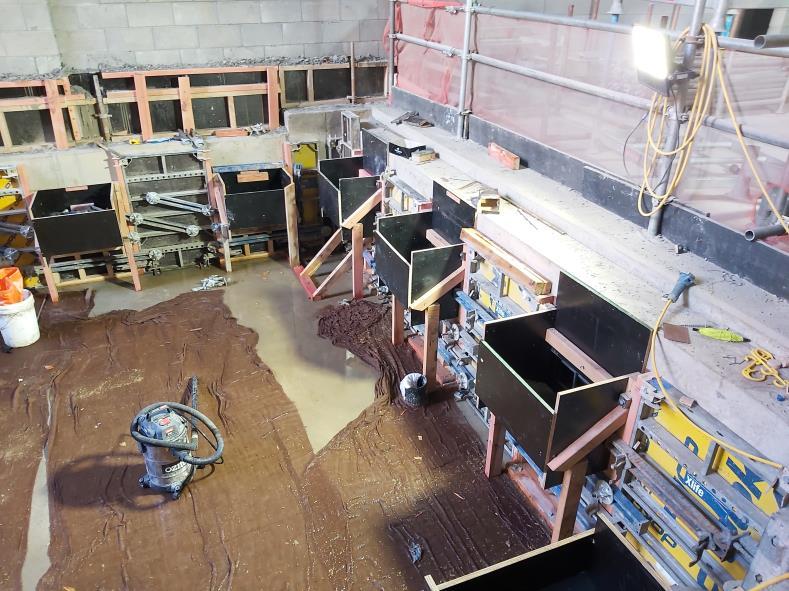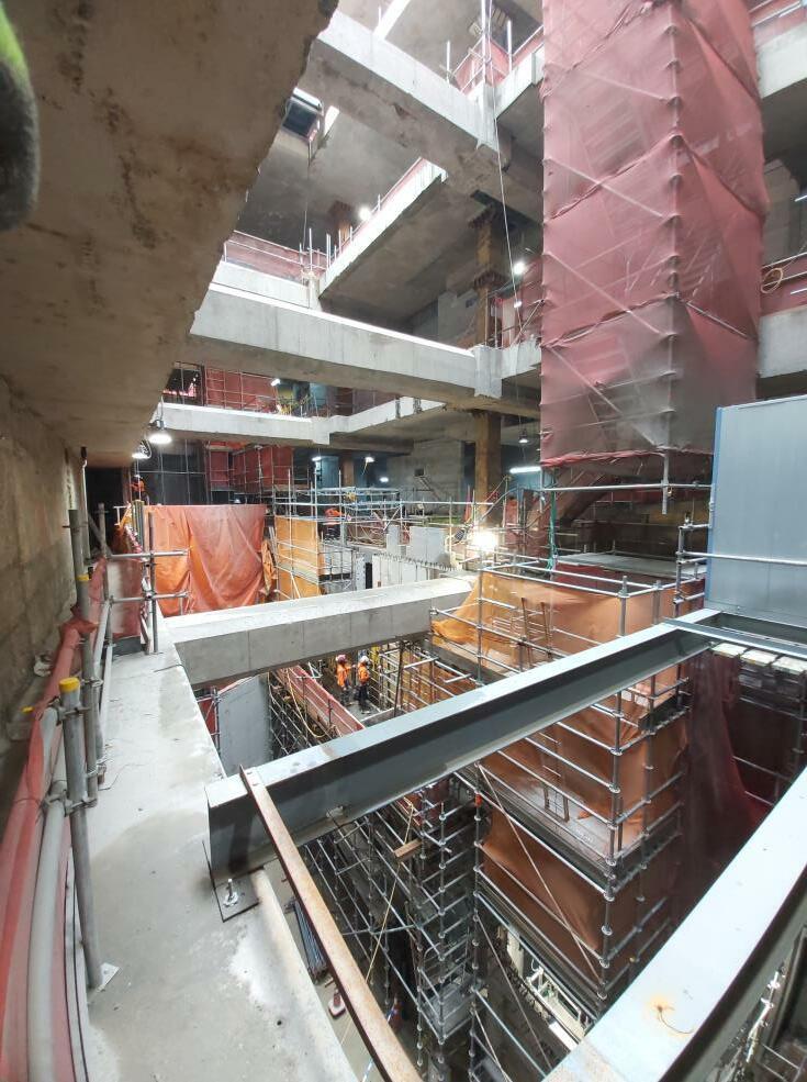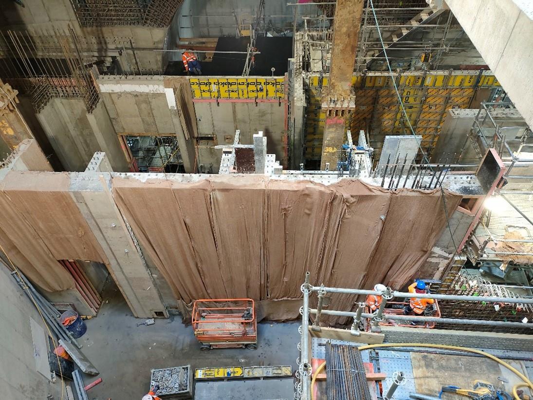 View from B2 looking west, Showing completed B4 slab, and "stadium"columns with steel fixing underway.