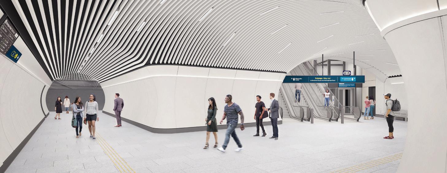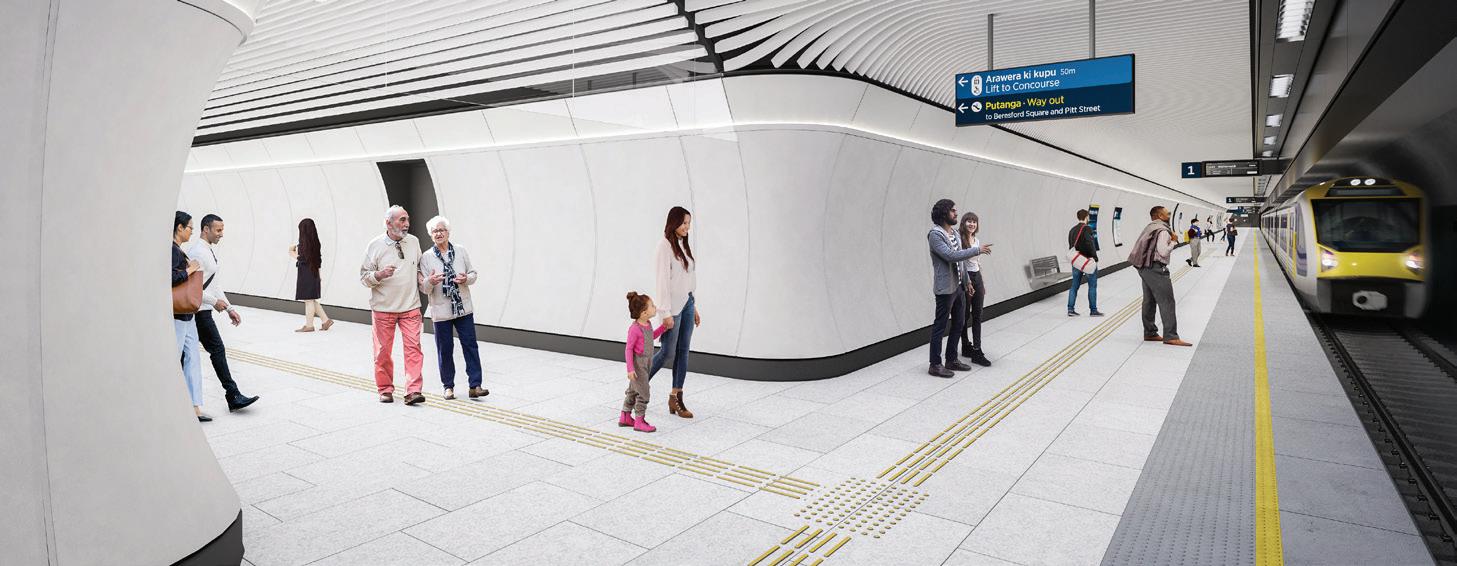 Q1 Installation of glass reinforced concrete (GRC) panel complete Q1-Q3 Installation of ceiling baffles Q3-Q2 Traction power rail testing within the tunnels Q2-Q1 Flooring installed Q2-Q1 Permanent lighting installed Q3 Testing and commissioning starts 2025 Q2 Fitout complete Visit: www.cityraillink.co.nz Call: 0800 CRL TALK (275 8255) press option 4 Email: karangahape@linkalliance.co.nz For more information follow the City Rail Link project on social media. The City Rail Link (CRL) is the largest transport infrastructure project ever to be undertaken in New Zealand. It will allow Auckland’s rail network to at least double in rail capacity. AT UP TO UP TO metres underground, Karanga-a-Hape will be the deepest of CRL’s stations metre-long underground platforms will cater for longer nine-car trains people per hour are expected to disembark at Karanga-a-Hape Station during peak times KARANGA-A-HAPE STATION, MERCURY LANE ENTRANCE Quick Facts: