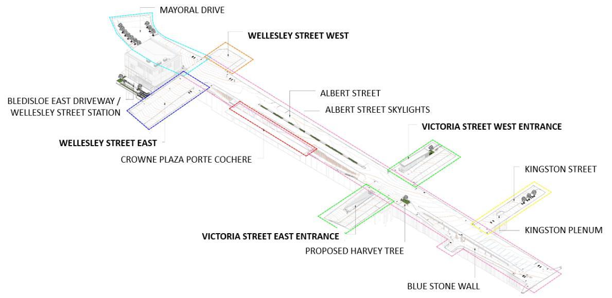 The PRR works extend along Albert Street from Wyndham Street to the southern end of the Aotea Station Designation 2500-1 located adjacent to 10 Mayoral Drive. This includes sections of intersecting roads including Victoria Street, Wellesley Street, Kingston Street, and Durham Street.