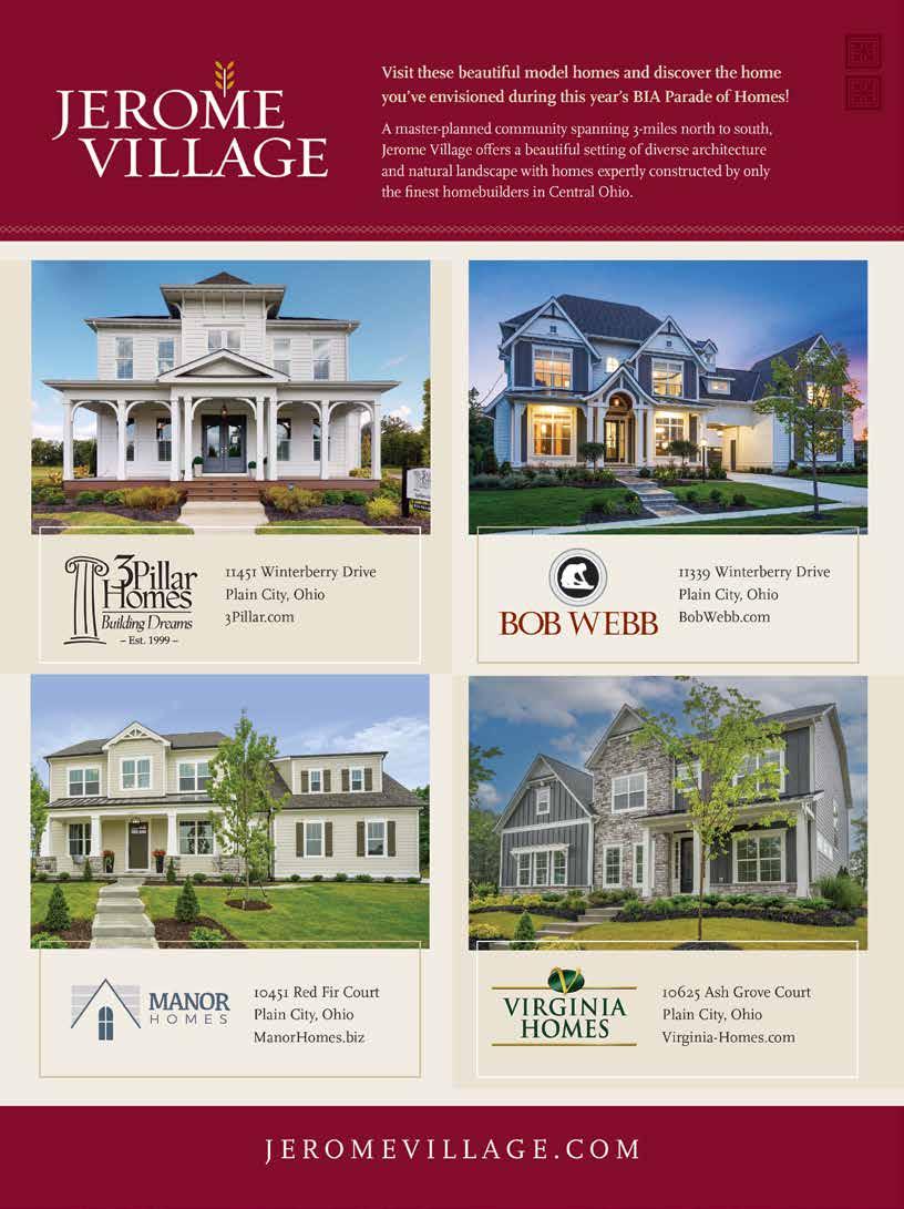 WELCOME TO THE 2023 BIA PARADE OF HOMES . . . 4 SCAN TO WIN! . . . . . . . . . . . . . . . . . . . . . . . . . . . 6 NAVIGATING THE PARADE . . . . . . . . . . . . . . . . . . . 8 FEATURE DEVELOPMENT . . . . . . . . . . . . . . . . . . . 10 Quarry Trails FASCINATING FEATURES . . . . . . . . . . . . . . . . . . . . 14 Treplus Communities Fischer Homes Steele Group TOUR NORTHEAST . . . . . . . 26 TOUR NORTHWEST . . . . . . 32 TOUR SOUTHEAST . . . . . . . 40 TOUR SOUTHWEST . . . . . . . 44 DREAM COME TRUE . . . . . . . . . . . . . . . . . . . . . . . 48 Longtime Parade of Homes attendee wins kitchen upgrade NO RECONSTRUCTING, NO REGRETS . . . . . . . . . . . 50 Builders’ advice for newcomers to homebuilding PARADE THROUGH PAINT TRENDS . . . . . . . . . . . . 56 Color trends over the years and timeless tricks PLANT WITH A PLAN . . . . . . . . . . . . . . . . . . . . . . 60 Tips for a landscape that is both trendy and timely LIGHT IT UP . . . . . . . . . . . . . . . . . . . . . . . . . . . . 64 Finding the perfect light for every space in your home CHARGED UP . . . . . . . . . . . . . . . . . . . . . . . . . . . 68 A look into USB ports in modern outlets and in-home EV charging stations INDEX OF ADVERTISERS . . . . . . . . . . . . . . . . . . . . 72 SEPTEMBER 21 - OCTOBER 8 Thursdays-Sundays Noon-6 p .m . 445 Hutchinson Ave., Ste. 280 Columbus, OH 43235 614.891.0575 www.biahomebuilders.com Jon Melchi Executive Director Malcolm J. Porter Public & Government Affairs Consultant Margaret McGuire-Schoeff Manager of Events & Home Tours Edna Mae Berkey Manager of Finance & Administration Kelly Harrop Manager of Government Affairs biaparade .com For Virtual Tours visit www.BIAparade.com INSIDE
