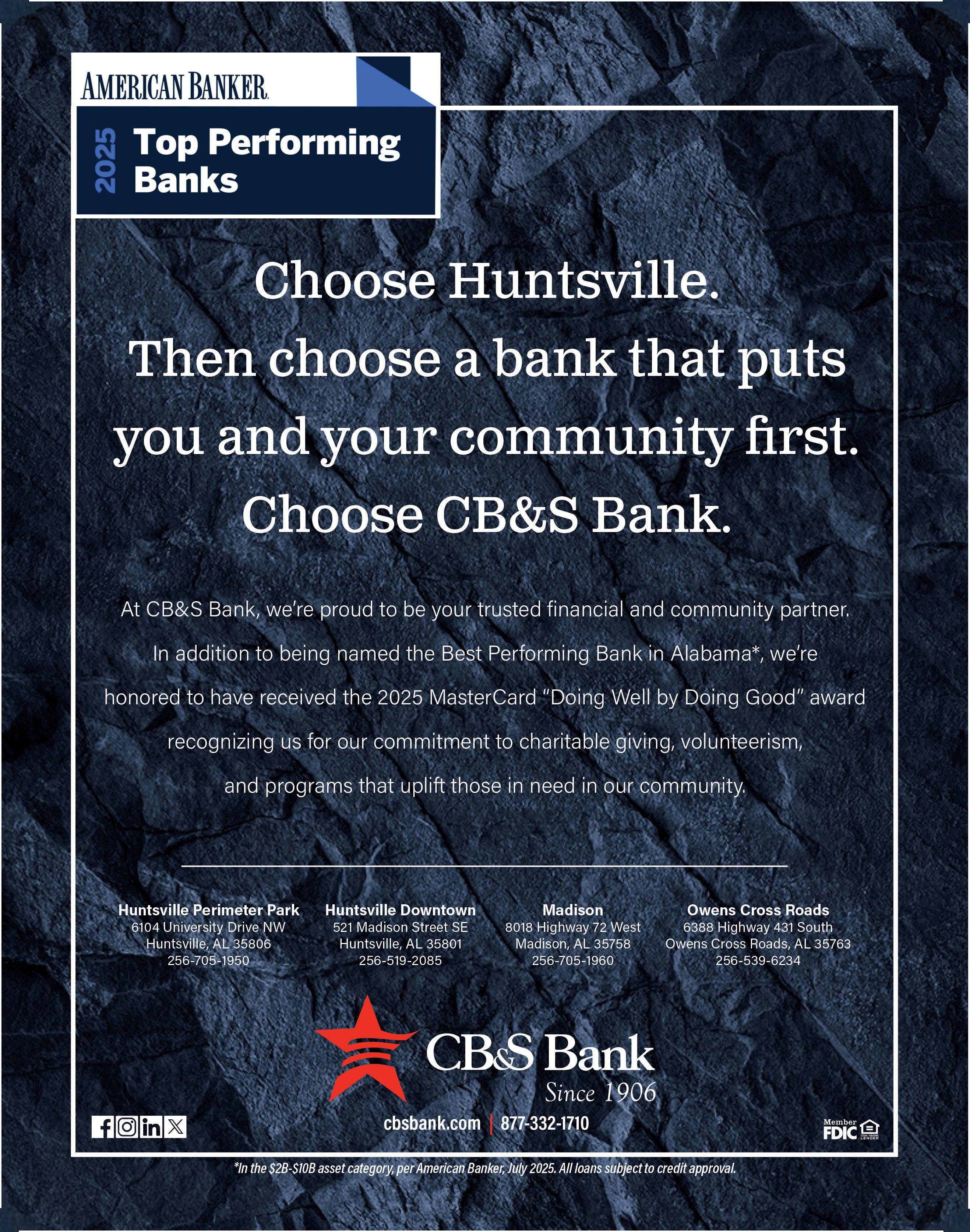 and Tennessee. In July 2025, CB&S Bank was named “Best Performing Bank in Alabama” and ranked No. 16 nationally by American Banker in the $2B to $10B asset category.