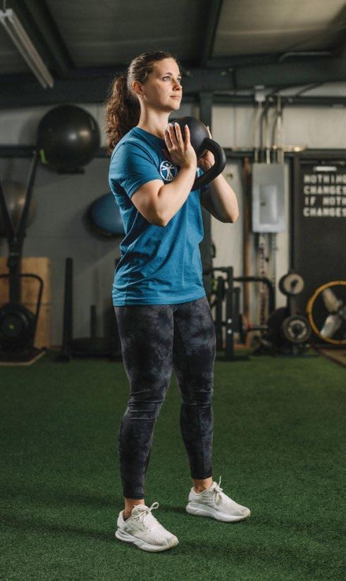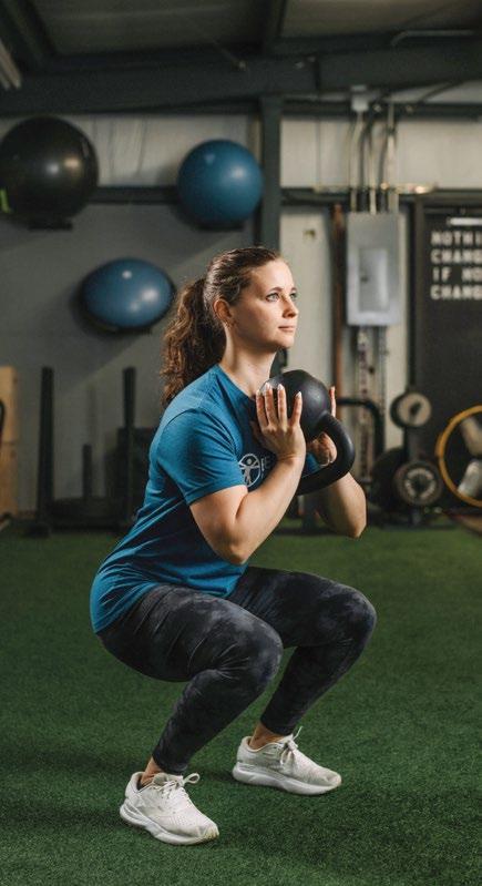 The goblet squat strengthens the hips and legs while reinforcing proper squat mechanics. Stand with feet shoulder-width apart holding a kettlebell or dumbbell at your chest. Inhale, brace your core, and sit your hips back and down while keeping your chest tall and spine neutral. Squat to parallel, or as low as mobility allows, then push the ground away through your heels to stand, exhaling as you drive up. Perform 10-12 repetitions for three to four sets.