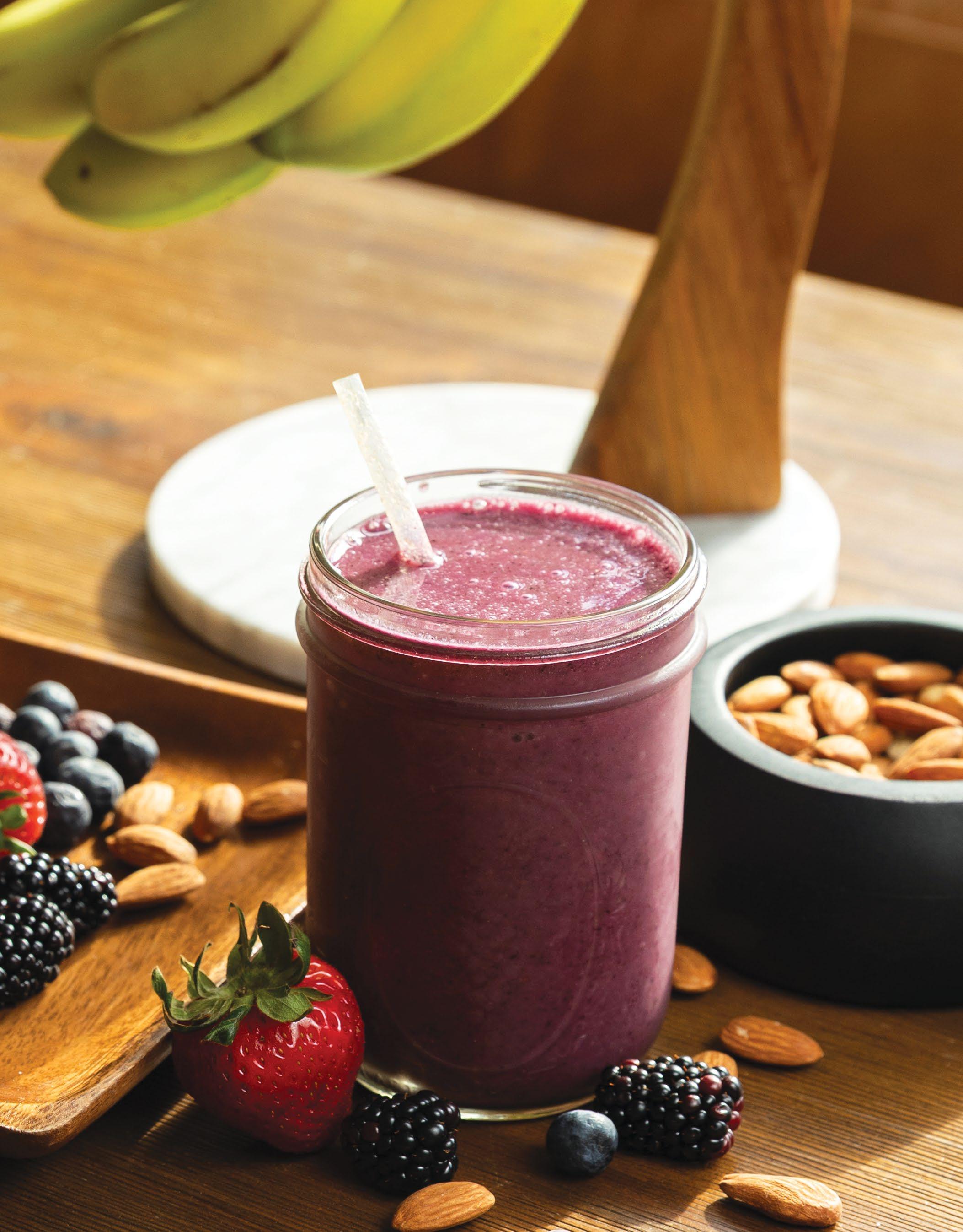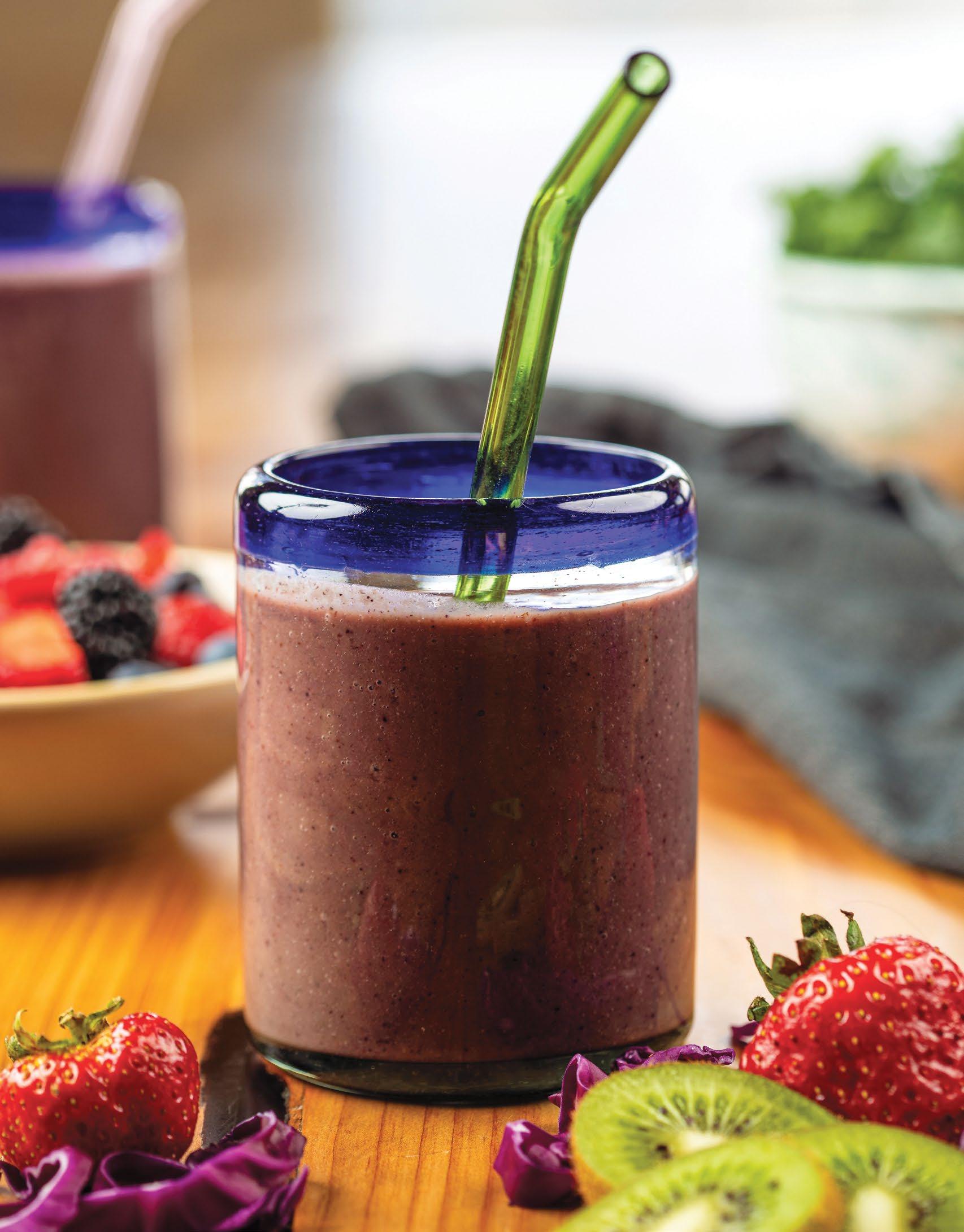 “This vibrant smoothie is one of my favorite ways to start the day, with up to 12 unique plants in a single glass. Berries are the star of the show. They are nutritional powerhouses, rich in anthocyanins – the com pounds that give them their deep purple and blue hues – which have been linked to heart health and reduced inflammation. Blended with other colorful plants, this smoothie delivers fiber and phytonutrients that nour ish the gut microbiome in one delicious glass.”