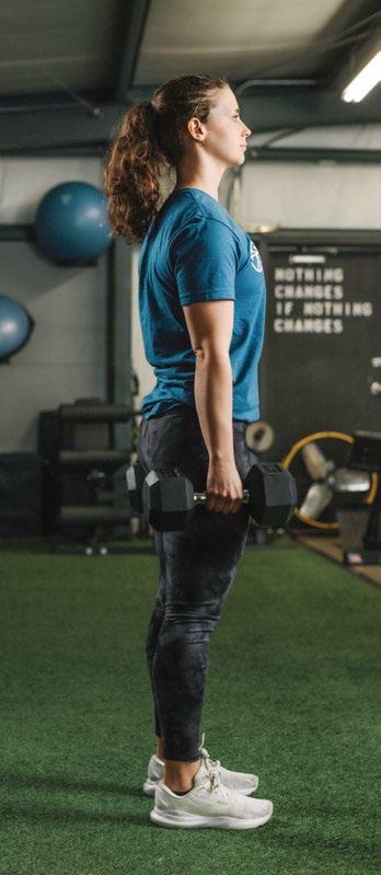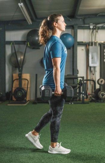 The farmer’s carry builds posture, grip strength, and core stability. Hold a weight in each hand at your sides, stand tall with shoulders set back and down, and brace your core. Walk forward with controlled steps, keeping your chest proud and the weights steady. Continue for 30-60 seconds or 25-50 feet per set.