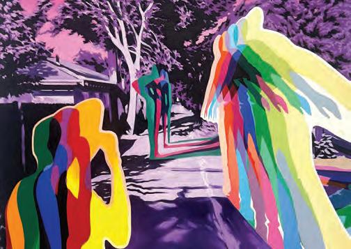 In Shadows and Alleyways, Benjamin Childress looks to the backstreets of Salt Lake City and its environs to bring into focus those who are often at the edges of our attention. In oil-on-canvas works like “Walkin Light,” “Shadows in the Alley” and “Pale Wall” (pictured), Childress foregrounds the human figures in bold colors, yet also turns them into layered, abstracted forms, suggesting both their vitality and motion and the way they can exist simply as blurry ideas at the corner of the eye. Jill Saxton Smith’s (un)contained, meanwhile, uses materials including plastics and found objects for mutable works to explore the concept of skin, as the artist describes in a statement: “Skin, in my practice, is more than flesh; it is metaphor and material, archive and interface. It marks where the self meets the world, where we are made vulnerable and where we find resilience.”