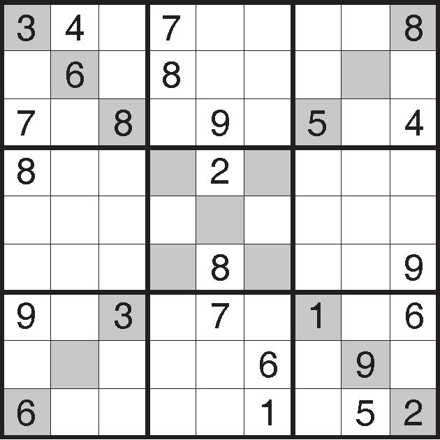 Complete the grid so that each row, column, diagonal and 3x3 square contain all of the numbers 1 to