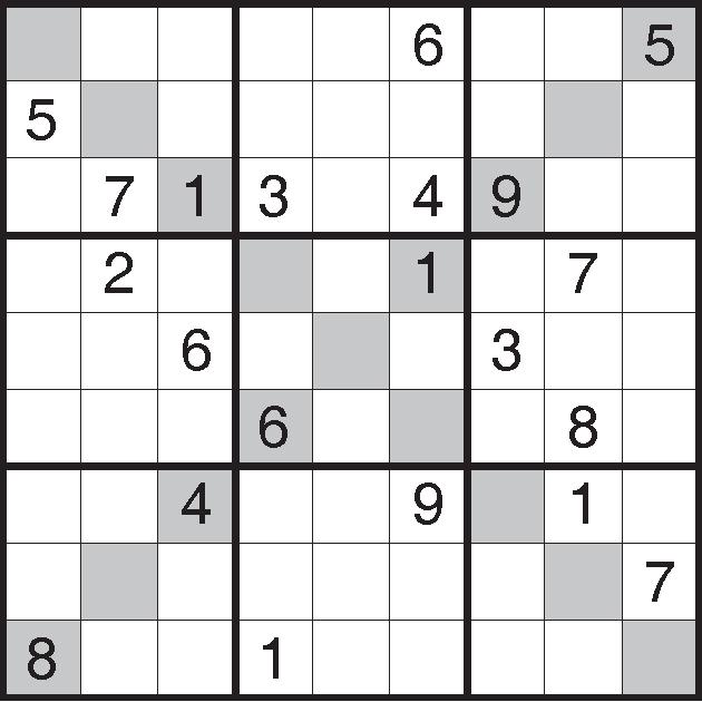 Complete the grid so that each row, column, diagonal and 3x3 square contain all of the numbers 1 to