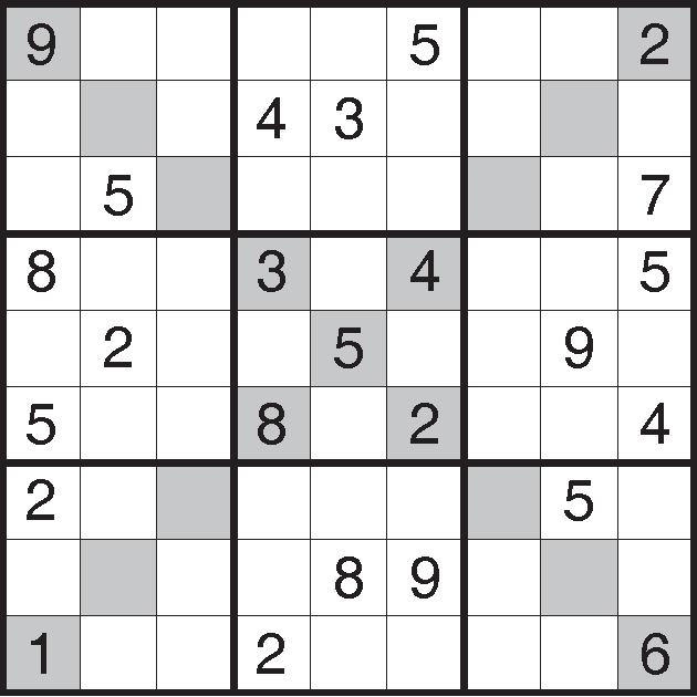 Complete the grid so that each row, column, diagonal and 3x3 square contain all of the numbers 1 to 9. No math is involved. The grid has numbers, but nothing has to add up to anything else. Solve the puzzle with reasoning and logic. Solving time is typically 10 to 30 minutes, depending on your skill and experience.