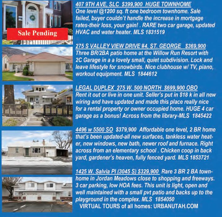 46 | DECEMBER 15, 2022 | COMMUNITY | | CITYWEEKLY.NET | VIEW OUR RENTALS ONLINE AT PARTLOWRENTS.COM VISIT OUR OFFICE LOCATION AT 440 S. 700 E. STE 203 801-484-4446 Must have 2 bdrm four-plex! Private patio, hook-ups, pet friendly! Best Deal! $1095 WVC/MAGNA Perfect 2+ bdrm 1 bath single family home! Garage, stainless steel appliances, hook-ups! $1795 U OF U/9TH & 9TH Tower 2 bdrm 2 bath Condo at the mouth of Emigration Canyon! Sweeping city views! Private balcony, floor to ceiling windows, garage parking and more! $1995 EAST BENCH Darling 1 bdrm w/ hardwood floors, on-site free laundry, vintage charm, internet included! SO CUTE! $1095 DOWNTOWN Shake it up this Holiday Season! THIS WEEK’S FEATURED PARTLOW RENTALS: Charming 1 bdrm in a divided Victorian home! Vintage vibes, gorgeous hardwood floors, modernized kitchen! $1295 9TH & 9TH Unbelievable 1 bdrm. 4-plex w/ Month to Month lease! Next to TRAX! Tile & Carpet, built in seat shelf in bedroom! ONLY $995 UNIVERSITY International
