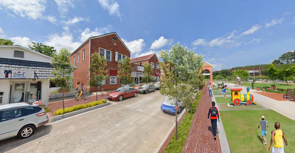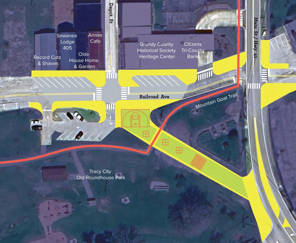 Tactical Urbanism (TURBO) uses low-cost, temporary design solutions to demonstrate potential long-term improvements in public space. This proposal recommends an intersection intervention at Depot Street and Railroad Avenue in Downtown Tracy City. By adding curb bulb-outs, we can reduce pedestrian crossing distances, calm traffic by tightening turning radii, and even create additional space for parking. Additionally, a pop-up activation that temporarily closes the angled portion of Railroad Avenue and transforms it into sport courts—featuring basketball, four square, and giant checkers—would provide an opportunity to test different uses for Old Roundhouse Park while improving safety for park users. This intervention would also reduce potential conflicts between vehicles and users of the Mountain Goat Trail. Furthermore, the reclaimed roadway space presents opportunities for public art, including community-designed murals, which can help foster local identity and enhance the vibrancy of the area.