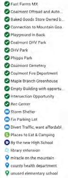 Building on the engagement strategies outlined above, the following section highlights key themes and insights that emerged from community-led design sessions with adults in each community. The team collaborated with members of the Grundy County community-supported by the South Cumberland Community Fund staff and local advocates—to lead engagement efforts in key focus areas. Community members were trained to serve as facilitators for design charrettes, a collaborative process that uses group dialogue and mapping to visualize desired outcomes. Workshops were hosted in each of the focus areas: Tracy City, Coalmont, Gruetli-Laager, Palmer, and Monteagle. Through these sessions, participants shared their perceptions of existing conditions and their aspirations for the future of their neighborhoods.