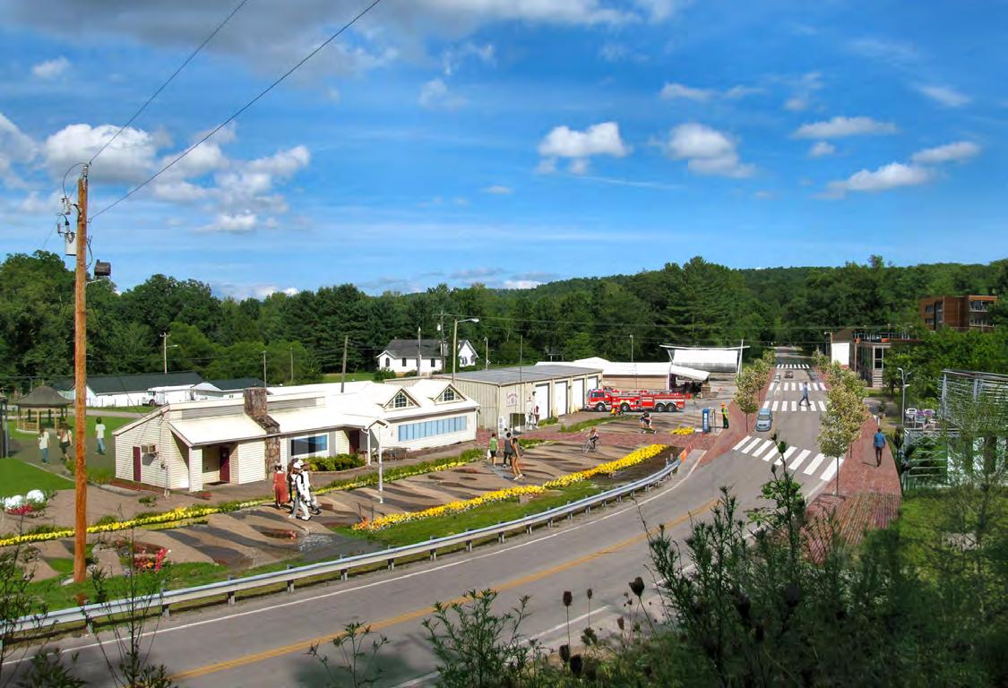 The concept transitions the Bank Road into a pedestrian path that incorporates the mountain goat trail. Removing this street helps make cars flow with the main roads and gives space to pedestrians. Surrounding the post office there are multiple paths for local workers to utilize during breaks and it can become a nice resting place along the mountain goat trail. With the open space around the community center there is the opportunity to incorporate a playground for the youth.