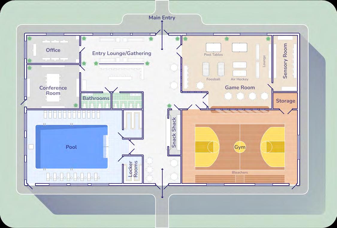 The scope of the concept ranges from dedicated spaces for school athletics to spaces set aside for community events to take place. One of the main spaces to come together as a community would be the Rec Center. This is a place that gives many options and opportunities for not just the youth, but members of the community to come together to hold events, learn and have fun.