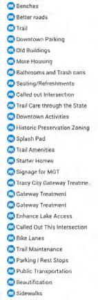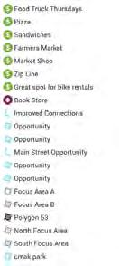 There was also enthusiasm for creative placemaking opportunities, such as integrating public art along the trail and developing more community gathering spaces—like skate parks, picnic areas, and fitness trails—that would serve as positive outlets for youth and families. Small-scale amenities like coffee shops, bookstores, and seasonal farmers markets were seen as opportunities to build community, support local entrepreneurs, and provide gathering spots without disrupting the rural feel of the area.
