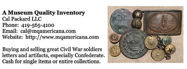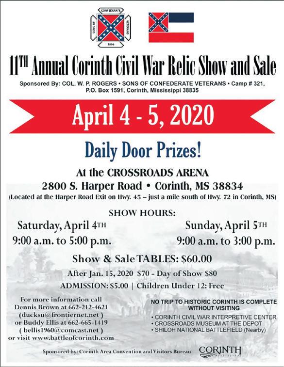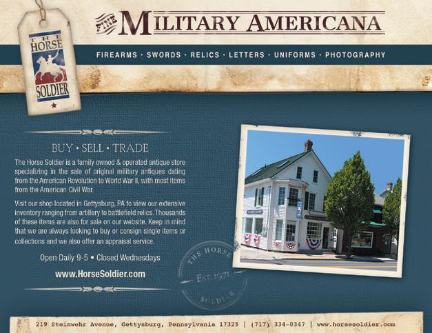Michael Simens HistoricalArms.com Tel: 440-744-9088 • mail@HistoricalArms.net Beautiful Winchesters A Conrad Ulrich Masterpiece Remarkable Presentations A Gift To Eli Whitney, Jr. Michael Simens HistoricalArms.com Tel: 440-744-9088 • mail@HistoricalArms.net Spectacular Groupings Inscribed And/Or Notarized Provenances Michael Simens HistoricalArms.com Tel: 440-744-9088 • mail@HistoricalArms.net Michael Simens HistoricalArms.com Tel: 440-744-9088 • mail@HistoricalArms.net Magnificent Swords Georgia Presentation To William J. Hardee. Later Confederate Lieut. General. We Buy, Sell, Authentic And Appraise World-Class Historical Artifacts Valuable Colts Michael Simens • HistoricalArms.com Tel: 440-744-9088 • mail@HistoricalArms.net Attributed To Rembrandt Peale Fine Antiques & Militaria Military Items 1650-1945 Armor Swords Firearms Bayonets Equipment Accoutrements www.csarms.com PO Box 602 9150 John S. Mosby Hwy. Upperville, Virginia 20185 Shop Phone: 540-592-7273 Email: sophiacsarms@aol.com C.S. Arms, Inc. Specialize in U.S. & British Militaria Old South Antiques, LLC Hickory Hill Mansion, 9222 Wickham Manor Way, Ashland, VA 23005 CARSON SQUEEGIE JENKINS 321.505.7524 WWW.SQUEEGIE.NET DESIGN SERVICES PRINT MEDIA ILLUSTRATIONS WEB ADVERTISING ANIMATIONS PACKAGE DESIGN CORPORATE BRANDING PRINT & MAGAZINE ADS LOGO DESIGN TEXTILE/ T-SHIRTS WEBSITES DESIGN MENU DESIGNS BROCHURES EVENT POSTERS BUSINESS CARDS 3D RENDERINGS MARKETING NEW BUSINESS START-UP PACKAGES AVAILABLE The Historical Shop Margaret & Cary Delery Box 73244 Metairie, LA 70033 Phone: 504-467-2532 c.j.delery@att.net www.historicalshop.com Since 1978 selling rare Americana Historical Shop The e Early American items through the Civil War artifacts, autographs, photography, currency, bonds, historical displays, military items, and more…… P.O. Box 160 • Kingston, TN 37763 Phone: 803-431-1798 • Email: vann@veteransattic.com www.VeteransAttic.com Vann Martin United Confederate Veterans, Grand Army of the Republic, Civil War Photographs and other Civil War items. Civil War Military Longarms a Specialty ConfederateArmsCompany.com 1209 Victor II Blvd., Morgan City, La. 70380 Cell: 985-518-1802 • Email: leegray@LHprinting.com Lee Gray Confederate Arms Company PO Box 129 Dover, TN 37058 Buying & Selling: Images Artillery Firearms Dug Relics Edged Weapons Non-dug Artifacts John & Nikki Walsh Fort Donelson Relics FortDonelsonRelics.com Full Line Civil War Artifact Dealer Email: john@fortdonelsonrelics.com P.O. Box 160 • Kingston, TN 37763 Phone: 803-431-1798 • Email: vann@veteransattic.com www.VeteransAttic.com Vann Martin United Confederate Veterans, Grand Army of the Republic, Civil War Photographs and other Civil War items. David K. Parks Military Antiques PO Box 180674 Utica, MI 48318-0674 Phone: 586-871-6462 Email: dkpma@comcast.net Offering a large selection of Civil War and Historical Memorabilia ranging from the Revolutionary War to World War I (emphasis on the American Civil War). On line catalog regularly offers over 700 items from nearly every category of collecting. www.RelicsOfHistory.com “Reproduction Antique Spectacles to suit all sights” Authentic reproduction Civil War era eyeglasses to fit your lifestyle. Historically accurate, ophthalmic quality eyeglass frames suitable for reading, distance, bifocals, progressive lenses, sunglasses & nonprescription tinted lenses. Made for full time wear. “Spectacles are most overlooked, most obvious way to spoil an otherwise fine impression.” Thomas Valenza, Optician When you are ready to complete your impression, visit us online for detailed information about our spectacles: www.HistoricEyeWearCompany.com Prices start at $139.95 862.812.4737 Left: Unidentified Union soldier wearing oblong spectacles (Library of Congress) Above Right: First Lieutenant Adam J. Slemmer, defender of Fort Pickens (U.S. Army Heritage & Education Center) The Best Civil War Era Spectacles Buying and Selling original Civil War Confederate & Union Buttons, Belt Buckles, and Accoutrements. NCCivilWarRelics.com PO Box 2122 • Morehead City, NC 28557 • Phone: 252-671-7770 Email: sales@nccivilwarrelics.com or AGaskins1@ec.rr.com Allen Gaskins North Carolina Civil War Relics Robert Jones • 119 Frances Ave. • Stanhope, NJ 07874 Phone: 973-810-2976 • Email: Bob33rd@optonline.net We sell original Civil War artifacts, both excavated and non-excavated. There is also a selection of mid-19th century antiques. Yankee Rebel Antiques www.YankeeRebelAntiques.com Proprietor, Robert Jones, is the author of seven books on Civil War subjects: The Civil War Canteen Civil War Artillery – A Pictorial Introduction Children at the Battle of Gettysburg –Their Unforgettable Summer The Civil War Canteen Second Edition, Battle of Gettysburg –The Relics, Artifacts & Souvenirs, The Civil War Soldier – His Personal Items, and The Civil War Canteen – Third Edition He has also written articles for North/South Trader Civil War magazine. Order his books online at http://www.lulu.com/spotlight/civilwarbooks Promoters of Quality Shows for Shooters, Collectors, Civil War and Militaria Enthusiasts Military Collectible & Gun & Knife Shows Mike Kent and Associates, LLC • PO Box 685 • Monroe, GA 30655 (770) 630-7296 • Mike@MKShows.com • www.MKShows.com February 1 & 2, 2020 Chickamauga (Dalton) Civil War Show November 14 & 15, 2020 Capital of the Confederacy Civil War Show December 5 & 6, 2020 Middle TN (Franklin) Civil War Show l l Antique Flag Conservation Services Save your family heirlooms and valuable textiles Specialist in Civil War flag Restoration and Conservation Custom affordable rates free estimates/fully insured email heritageconservationva@gmail.com Or call Josh Phillips at 540-320-6588 Heritage Conservation, LLC SELLING CIVIL WAR MILITARIA Journey’s End Antiques Antiques • Collectibles Paper Money • US Coins Furniture • Glassware Old Toys, Dolls & Trains Paul Brill apbrill@earthl