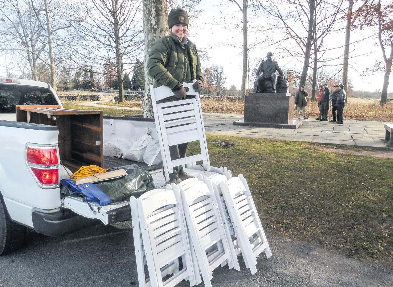 The next morning opened cold, but clear, good marching weather. I drove up, parked near the high water mark and walked over to the National Cemetery and saw Meghan Weber of the National Park Service unloading chairs. When I took a photo, she looked at me and asked, “Why are you taking my photo, I’m not a VIP.” Without you, Meghan and your co-workers, there would be no Remembrance Day.