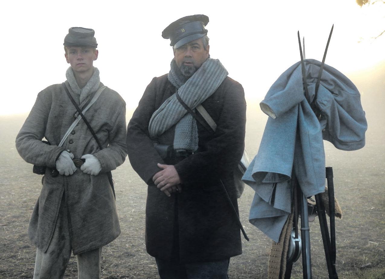 The Delaware River Blues, “K” Company, 1st Delaware Regiment, was walking across the field. Their unit was on McPherson Ridge the first day. They marched into Gettysburg with 288 men; 10 were killed, 54 wounded, 13 missing; the regiment was credited with capturing a Confederate flag.
