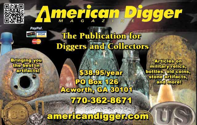 Both shows Open to Public: Saturday: 9-5 Sunday: 9-3 Dealer Setup: Friday 1-7 PM Sat 7-9 AM americandigger.com/american-digger-events/ • Swords & Knives • Antique Firearms • Dug & Non-dug Relics • Civilian Items & Jewelry • Bottles & Stone Artifacts • Art, Photos, & Books • Militaria & Americana • All Eras to WWII • Metal Detectors • Awards & Prizes this and more: Display!Trade! Buy!Sell! *Temporary date change to avoid New Years Eve conflict.