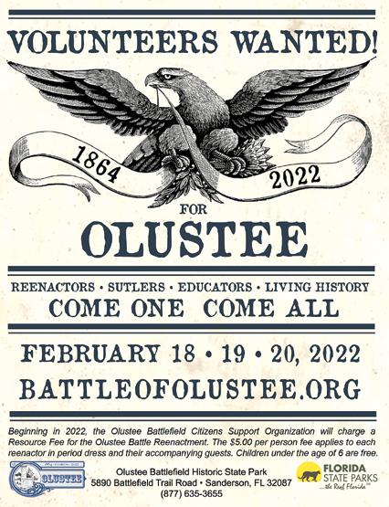 Olustee Battlefield Historic State Park will host the weekend long 45th Annual Reenactment commemorating the 158th anniversary of the Battle of Olustee. More than 1,500 living historians will give presentations of both civilian and military life during the Civil War. Events will include educational exhibits and speakers, battle reenactment, a skirmish, medical demonstrations, ladies’ tea, sutlers, artillery night firing, an old-fashioned barn dance! Spectators can visit authentic campsites, view artillery inspections, living history programs, listen to a period music and watch the battle reenactment. Festivities will end with the Battle of Olustee Ball at the Ball Tent. Period attire re-quired. Ball is for participants only. For information; 877-635-3655; battleofolustee.org.