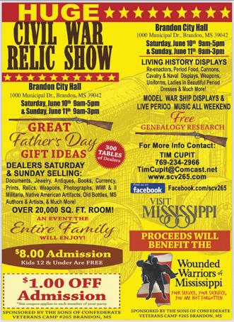 We are the oldest Military History and Civil War show in the Mid-South and we are growing! This year will be our 55th show. Located at the Landers Center in Southaven, MS. Friday, the show will open at 2 p.m. for our “First Lookers” and the general public and will close at 7 p.m. Saturday, show hours 9-5 p.m. Admission is $10 for adults and children under 12 are free. For more information please visit our Facebook page at midsouthmilitaryhistory or call Don at 901-832-4708.