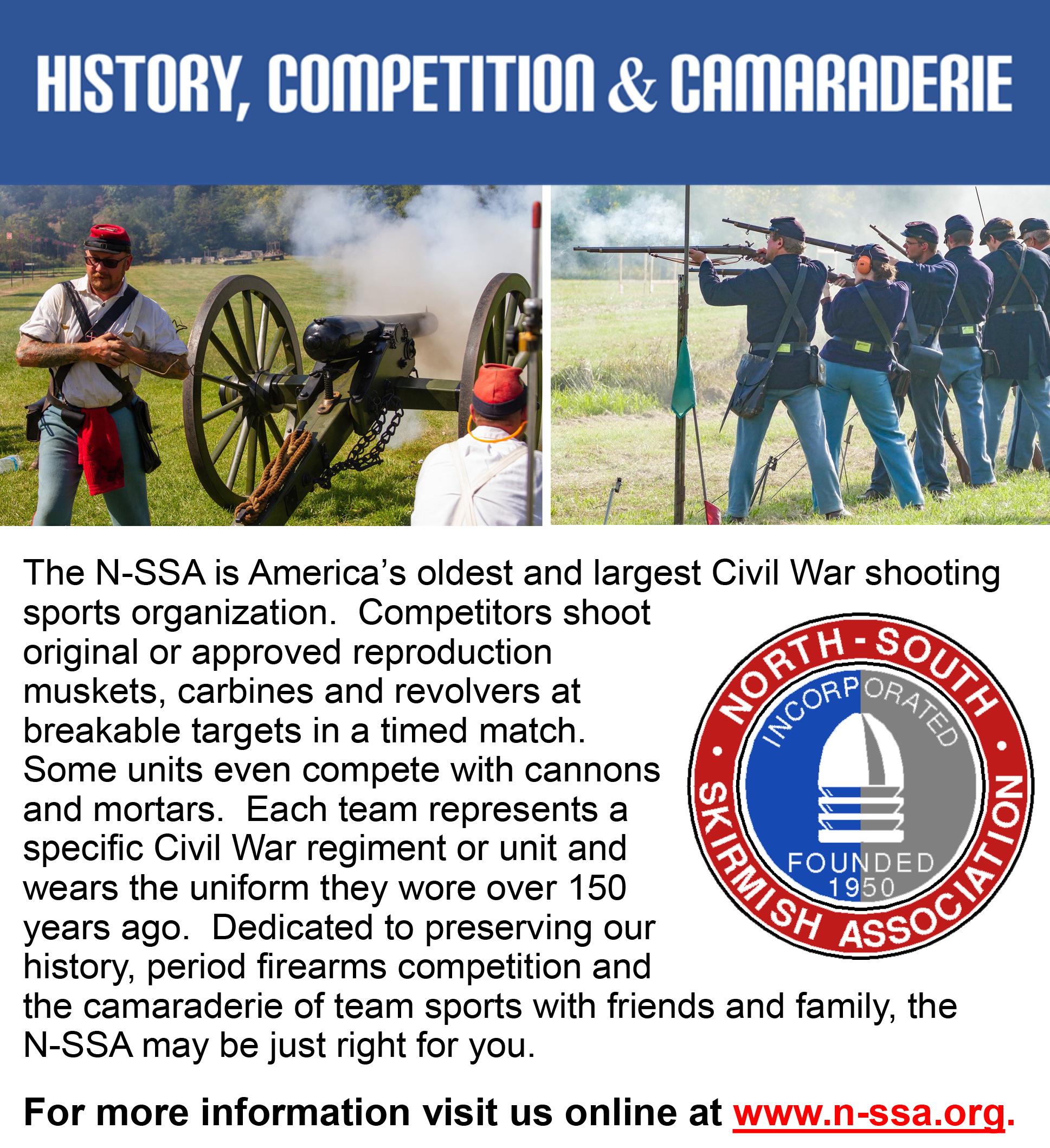 The North-South Skirmish Association 147th National Competition near Winchester. Over 3,000 uniformed competitors in 200 member units compete in live-fire matches with muskets, carbines, revolvers, mortars and cannon plus costume competitions and historical lectures. The largest Civil War live-fire event in the country. Free admission, large sutler area, and food service. For more information visit the N-SSA web site: www.n-ssa.org.