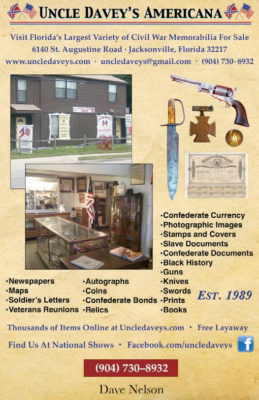 46 CWN September 2020 CivilWarShop.com Offering the Finest Investment Grade Military Memorabilia since 1981 Buy – Sell – Trade Certified Appraisal Services Life Member Company of Military Historians Lynn and Will Gorges, Proprietors 3910 US Hwy. 70 East New Bern, NC 28560 (252) 636-3039 • civilwarshop@gmail.com www.CivilWarShop.com Long Bay Salvage LLC specializes in the recovery and restoration of authentic Civil War Cannon with an emphasis on 10-Inch Columbiads, what has become a rare piece of Civil War history. Long Bay Salvage also works with historical entities (government and private) to recover and conserve large historical artifacts with a specialty in large field and naval artillery pieces. Glenn Dutton 770-351-7565 Rufus Perdue Perdue 843-315-9818 PLEASE CONTACT US FOR MORE INFORMATION www.LongBaySalvage.com Promoters of Quality Shows for Shooters, Collectors, Civil War and Militaria Enthusiasts Military Collectible & Gun & Knife Shows Presents The Finest Mike Kent and Associates, LLC • PO Box 685 • Monroe, GA 30655 (770) 630-7296 • Mike@MKShows.com • www.MKShows.com Northwest Georgia Trade Center 2211 Dug Gap Battle Road Dalton, GA 30720 February 1 & 2, 2020 Chickamauga (Dalton) Civil War Show Williamson County Ag Expo Park 4215 Long Lane Franklin, TN 37064 December 5 & 6, 2020 Middle TN (Franklin) Civil War Show l Shiloh Buying & Selling Authentic Civil War Artifacts 2405 Oak Grove Road Savannah, TN 38372 731-438-3541 ShilohRelics.com History@shilohrelics.com owner Rafael Eledge .com Dealing in the Finest Authentic Militaria Since 1995 with an Emphasis on the American Civil War Pistols, Muskets, Carbines, Rifles, Bayonets, Swords, Uniforms, Headgear, Belt Buckles, Cannon, Buttons, Bullets, Artillery Implements Etc. MidWestCivilWarRelics.com Bowie Knifes, Civil War Swords, Confederate D-guards, Antique Firearms, Dug Relics, Buckles & Belts, Identified Relics, Letters, Documents, Images, Currency, Uniforms, Head Gear & Flags. 3500 Shacklett Rd • Murfreesboro, TN 37129 tom@stonesrivertrading.com • (615) 336-2188 StonesRiverTrading.com Tom Hays Proprietor We carry all types of relics, dug & non-dug, Confederate & Federal. 100% Guaranteed. A strong emphasis on dug relics, but also a full line of non-dug relics of all types. Over 30 years experience with a full time, online store since 1997. We also have a shop located five miles from Stones River National Battlefield that is open by appointment. www.CollegeHillArsenal.com Tim Prince College Hill Arsenal PO Box 178204 Nashville, TN 37217 615-972-2418 Mid West Civil War Relics MidWestCivilWarRelics.com Allen Wandling Phone: 618-789-5751 Email: awandling1@gmail.com Museum Quality Civil War Union & Confederate Artifacts! We handle the Best Antique Bowie Knifes, Civil War Swords, Confederate D-guards, Antique Firearms, Dug Relics, Buckles & Belts, Identified Relics, Letters, Documents, Images, Currency, Uniforms, Head Gear & Flags. Preston Bain Nashville, TN (615) 397-5186 www.NashvilleRelics.com Nashville Civil War Relics “Old times there are not forgotten” Coles Civil War Shop.com Come by and see me at the shop or place an order online. email hmcole2@comcast.net Mac Cole 13119 River’s Bend Blvd. Chester, Va 23836 wk - 804-681-0945 cell-804-314-9940 Hours Mon - Fri 10-5 Sat - 10-3 P.O. Box 342 Thompsons Station, TN 37179 615-585-0115 Email: brubon2@bellsouth.net Franklin Relics www.AmericanRelics.net Allen Phillips 1014 Reservoir St., Suite B Harrisonburg, VA 22801 A P.O. Box 342 Thompsons Station, TN 37179 Email: brubon2@bellsouth.net Franklin Relics Specializing in Accoutrements, Edged Weapons, Firearms and Uniforms FranklinRelics.com Bruce Hohler Proprietor Specializing in Buttons, Buckles, Currency, Hat Devices and other Military Artifacts. www.AmericanRelics.net Allen Phillips 1014 Reservoir St., Suite B Harrisonburg, VA 22801 American Relics Phone: 540-476-1969 Email: americanrelicsnet@gmail.com www.CivilWarBadges.com Everitt Bowles, Owner • 770.926.1132 1036 Washington Avenue Woodstock, Georgia 30188 The Largest Selection of GAR & UCV Hundreds of Memorabilia Items from Rev War through Vietnam Secure & Easy Guaranteed Authenticity of Every Item 8895 Town and Country Circle • Knoxville, TN 37923 Phone: 865-693-3007 info@armyoftennesseerelics.com Civil War Artifacts Nick Periut Proprietor ArmyofTennesseeRelics.com Buying and Selling High Quality Images, Belt Buckles and Plates, Artillery Shells, rare Bullets and Buttons! Richard Gersten (708) 786-8630 PO BOX 31113, CHICAGO, ILLINOIS 60631 www.YankeeCollector.com Specializing in Early Americana, Civil War American Indian, Old West, WW I & II Guns, Swords & Memorabilia www.uniondb.com 34 York St Gettysburg, PA 17325 Phone: 717-334-2350 • Email: bsynnamon@gmail.com Specializing in Authentic Civil War Artifacts The Union DrUmmer Boy A Museum Where You Can Shop! Contact Glenn Dutton at: glennjdutton@aol.com or 770-351-7565 BUYING & SELLING Field & Heavy Artillery Cannon, Shells, Fuses & Etc. Rare Accoutrements Michael Simens HistoricalArms.com Tel: 440-744-9088 mail@HistoricalArms.net The Only Complete Beaumont-Adams CS Naval Rig Michael Simens HistoricalArms.com Tel: 440-744-9088 • mail@HistoricalArms.net Magnificent Swords Georgia Presentation To William J. Hardee. Later Confederate Lieut. General. We Buy, Sell, Authentic And Appraise World-Class Historical Artifacts Fine Antiques & Militaria Military Items 1650-1945 Armor Swords Firearms Bayonets Equipment Accoutrements www.csarms.com PO Box 602 9150 John S. Mosby Hwy. Upperville, Virginia 20185 Shop Phone: 540-592-7273 Email: sophiacsarms@aol.com C.S. Arms, Inc. Specialize in U.S. & British Militaria www.OldSouthAntiques.com Old South Antiques, THE CONFEDERATE Old South Antiques, LLC Hickory Hill Mansion, 9222 Wickham Manor Way, Ashland, VA 23005 CARSON SQUEEGIE JENKINS 321.505.7524 WWW.SQUEEGIE.NET DESIGN SERVICES PRINT MEDIA ILLUSTRATIONS CORPORATE BRANDING PRINT & MAGAZINE ADS LOGO DESIGN TEXTILE/