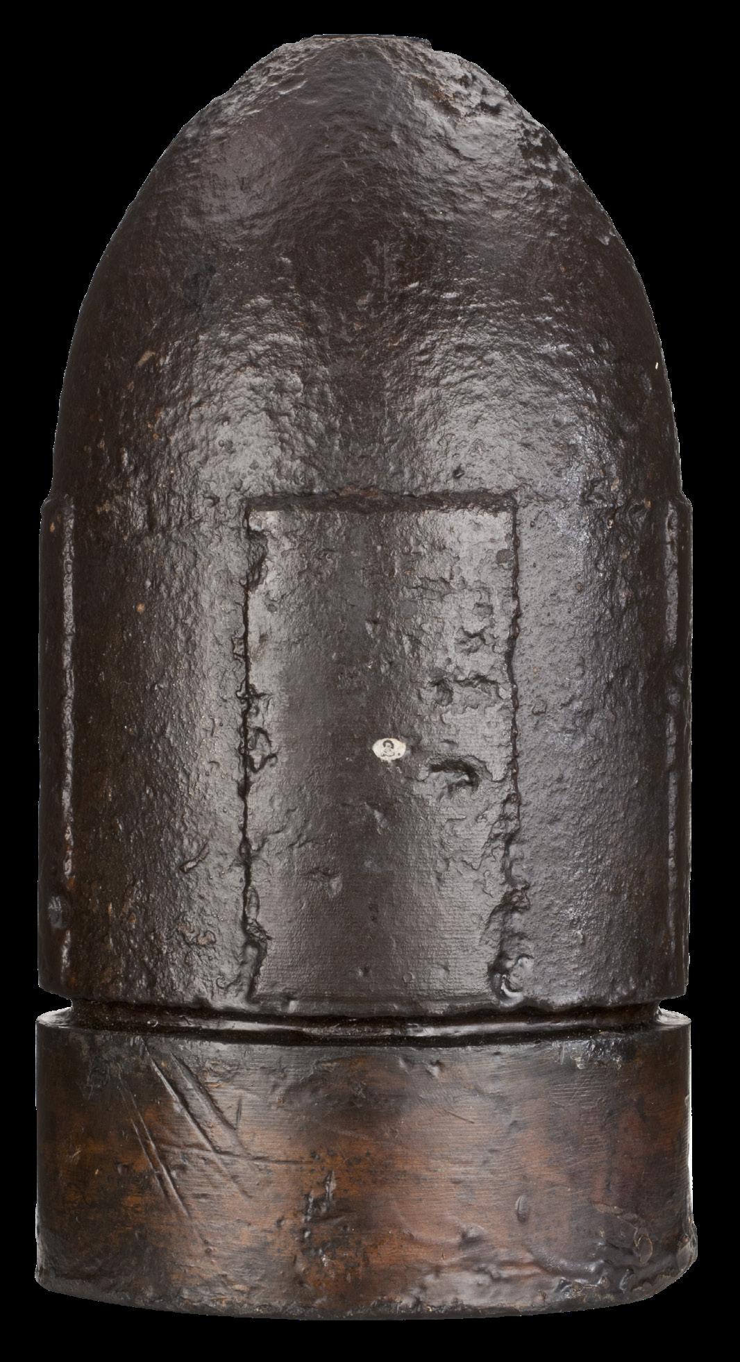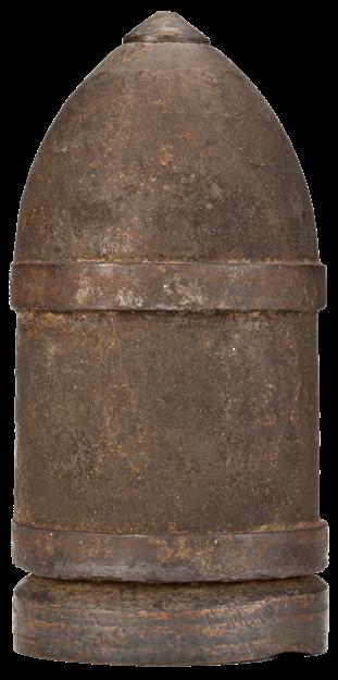 flame’scommunicationchannel.Theblackpowderburstingchargewaspouredinloosearoundthebullets.Thismethoddid notworkverywellandoftenonlysucceededinblowingthefusesout.Projectilesfilledwithbulletsusedascaseshotarerare. Thisspecimenwasrecovered,alongwithotherConfederateandUnionprojectiles,fromthepost-CivilWardumpsitelocated neartheConfederatePowderWorksinAugusta,Georgia.
