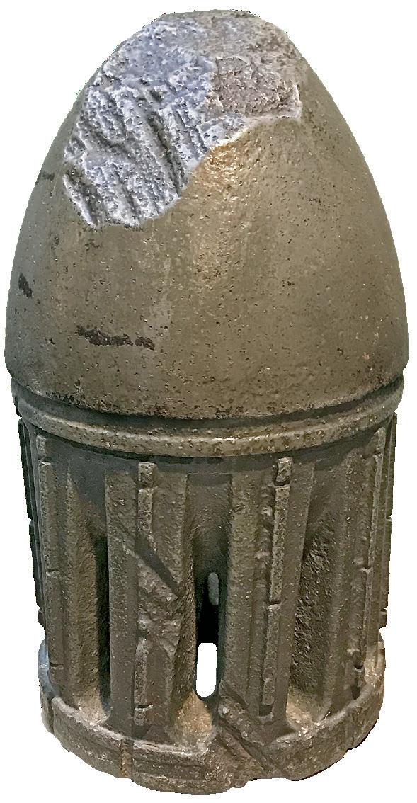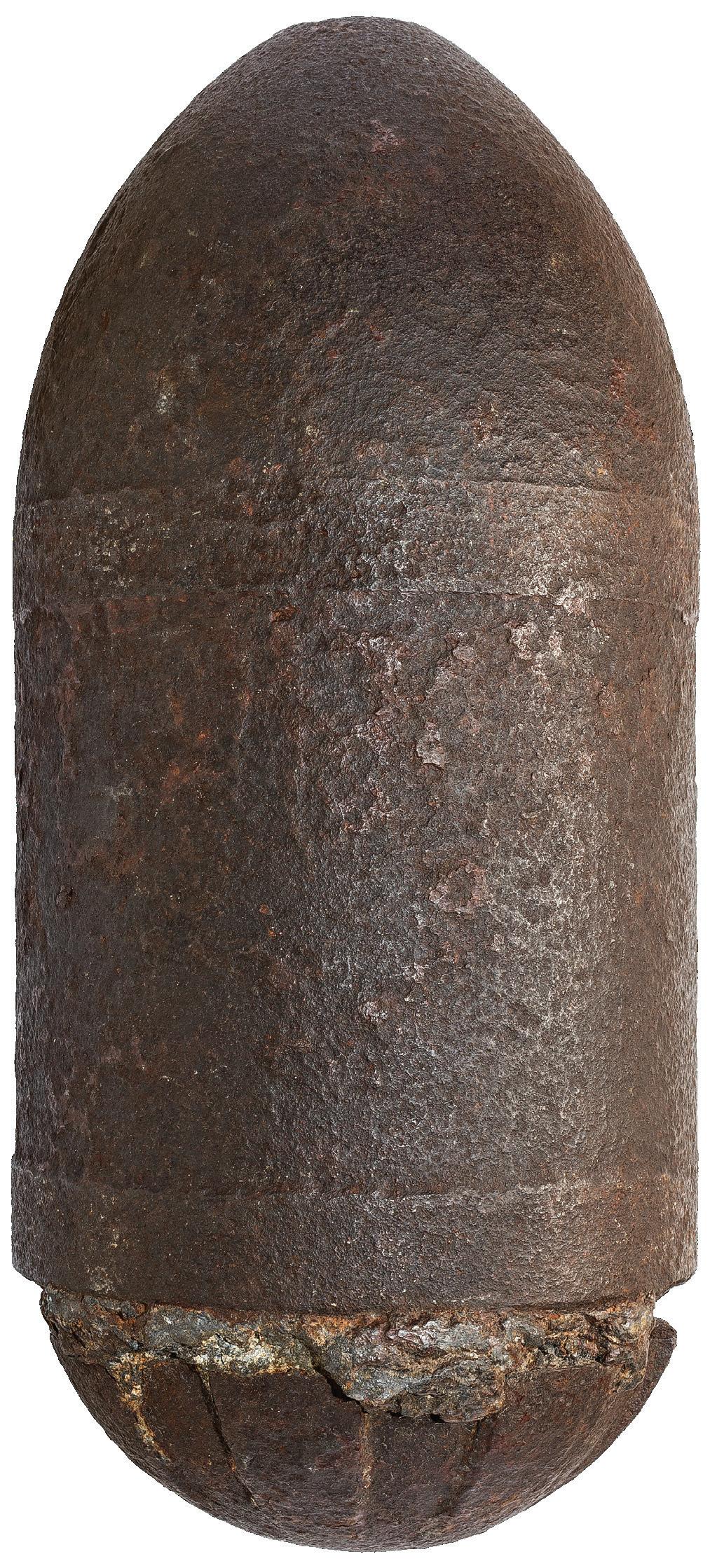 Diameter: 3.58 inches Bore Diameter: 3.67 inches Gun: 6-pounderSmoothbore Weight:5.2poundsConstruction: Case shot Fusing System:Time,Bormann Fusing Material:LeadandtinalloyFuse Thread Diameter: 1.65 inches Fuse Hole Length:.75 inch Sabot: Cup Sabot Material: Wood Wall Thickness: .31 inch Matrix Material: None Case Shot Material: Lead Case Shot Diameter: Varied calibers Bormann time fuse Brass supportplug Sharpsring tail bullet Horseshoe powdertrain