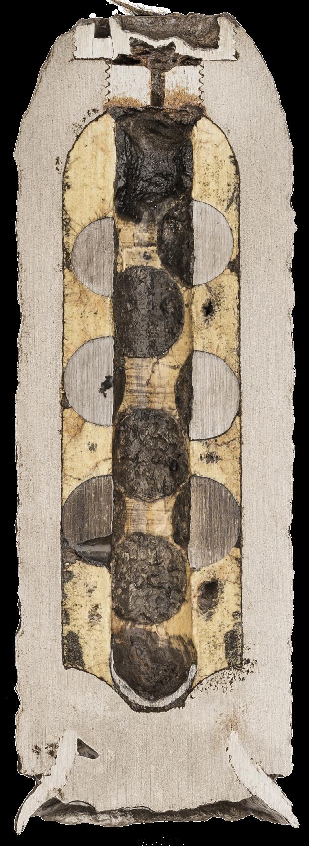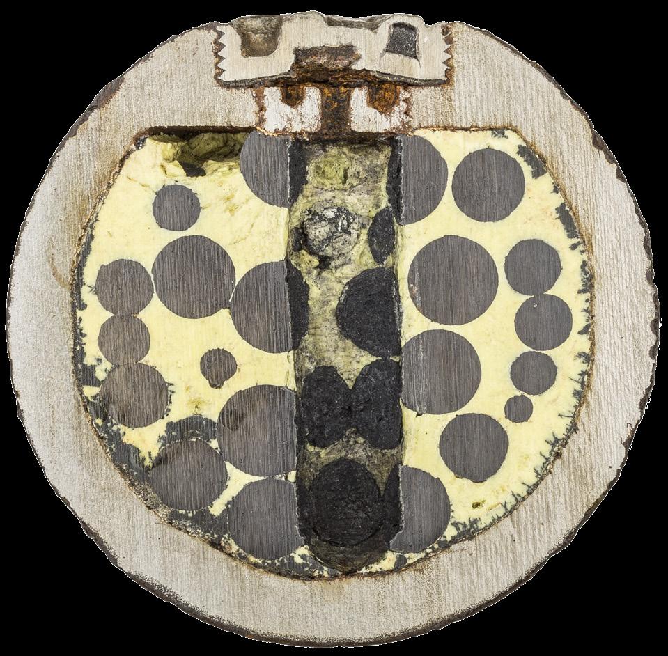Inthisexample,riflebulletswereutilizedasthecaseshotmaterialincluding3-ring.58caliberbullets,3-ring.69caliberbul lets,andU.S.ring-tailSharpsbullets.IthasabrassBormannsupportplug(underplug)thatiscountersunkonbothsidesof