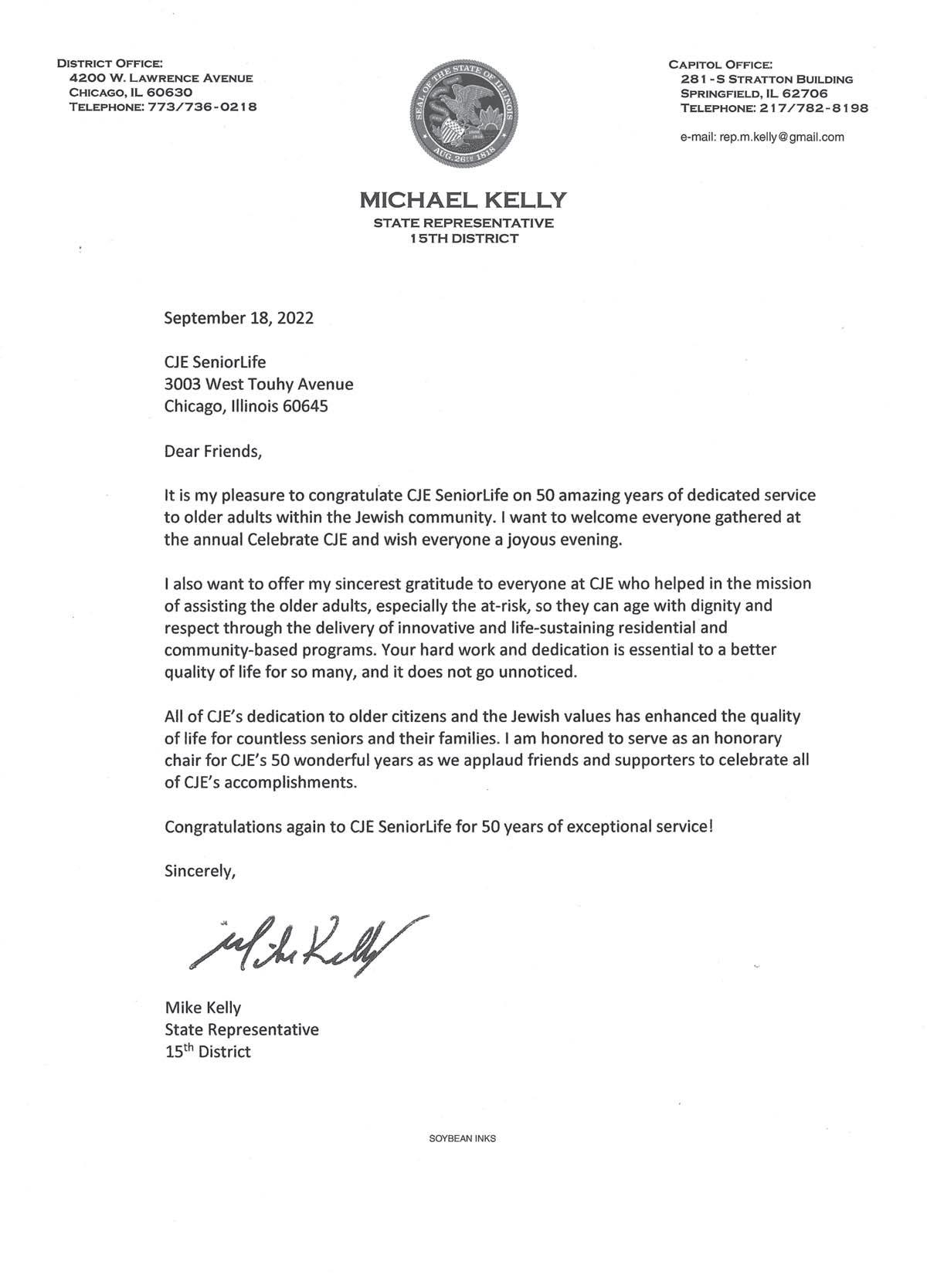 KOLTHAKAVODOCCJE FOR 50 YEAARS OF DEDDICATION TO CH ICAGO’S JEWWISH COMMUNITYWAARMLY, TERRI & SSTEVVE BBARNETT Barnett - Quarter Page AdThe Man of Silver Wishes Mazel Tov to CJE on its GOLDEN ANNIVERSARY!!! The Man of Silver is also there to service Chicagoland’s seniors and their families as they downsize and inherit items . We evaluate and buy in their homes unwanted items such as Sterling Silver Flatware and Tea Sets, Gold and Silver Jewelry, Coins, Watches, and even Silver Plated Items Jordan Kagan 847 668 themanofsilver.net5442 The Man of Silver - Quarter Page AdonCongratstoThanksforlettingushelpshareyourstory.CJESeniorLifeover40yearsofservicetothecommunity. Best wishes to CJE SeniorLife from Dean Ralph Keen and the faculty and staff of UIC Honors College Chicago’s Public Research University Co ngratulations to CJE for outstanding service to our MARYcommunity!!ANNTUFT Sheri S.Hokin Hokin Sternberg Insurance Services Associated with FGMK Insurance Division 2801 Lakeside Drive, 3rd floor Bannockburn, IL60015 847-562-9707 or hokinstern@yahoo.com847-964-5126orshokin@fgmkins.com Tuft & Associates - Quarter Page AdIN HONOR OF JORDYANDBERGER CJE’S DoloresVOLUNTEERSFromandRalphBarnett CJE SeniorLife Salutes 320 Park Avenue New York NY 10022-6839 1-800-468-3785 mutualofamerica.com John R. Greed Chairman, President and Chief Executive Officer for their commitment to enhancing the lives of older adults and their families Providing retirement products and related services since 1945 Mutual of America Life Insurance Company CJE SeniorLife_3.5x4.875_2018.indd 1 8/14/2018 11:35:11 AM