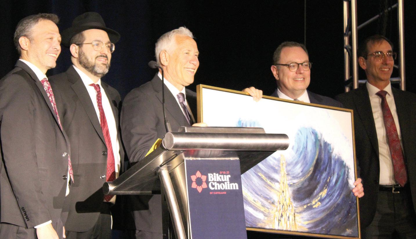 Larry Weisman, center, accepts the Community Leadership Award presented to him and his wife, Lori, by master of ceremonies Daniel Schwartz, Bikur Cholim Executive Director Rabbi Aryeh Leib (Alan) Joseph, Bikur Cholim’s board president Dr. Michael (Meir) Pollack and Howard Goldman during The Heart of the Land gala on Feb.16 at the Hilton Cleveland Downtown.