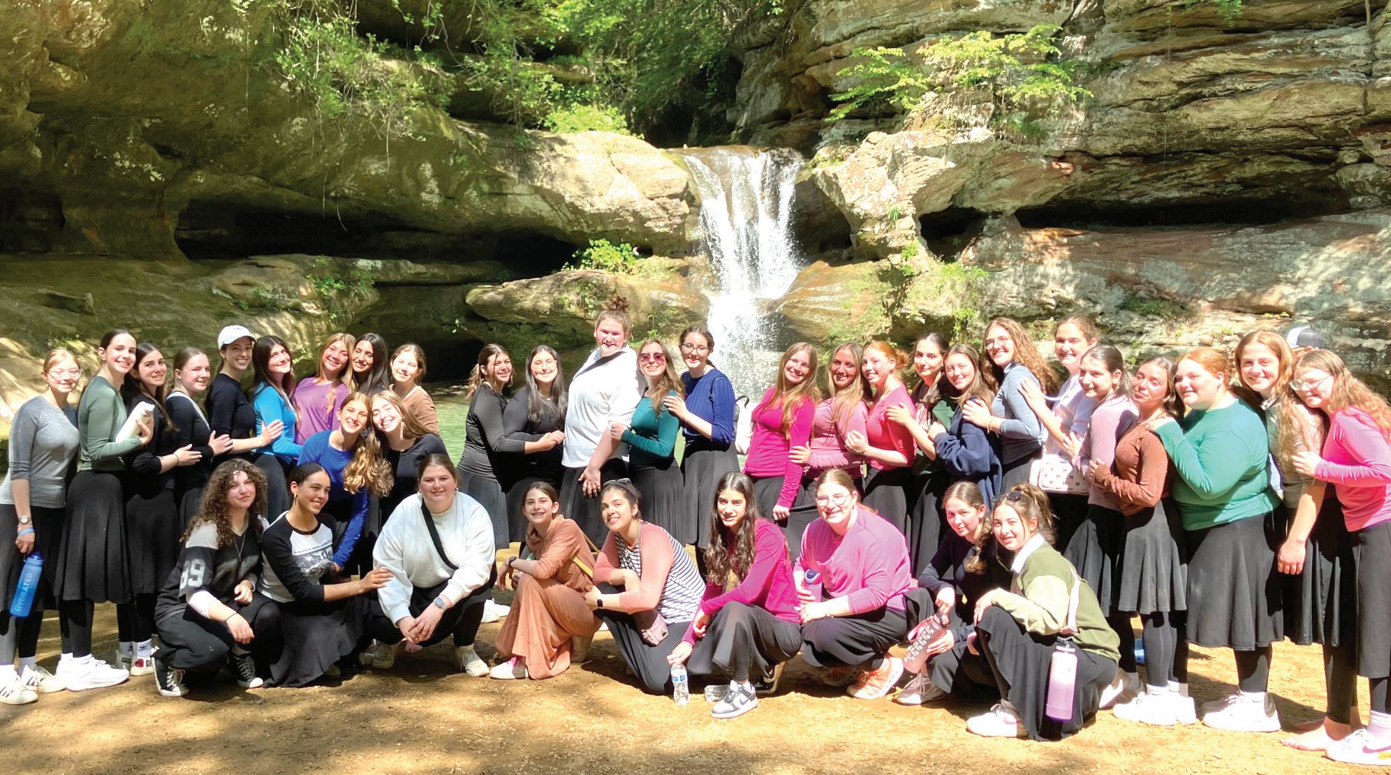 High School girls stop for a group photo during a hike in Hocking Hills for the annual Spring