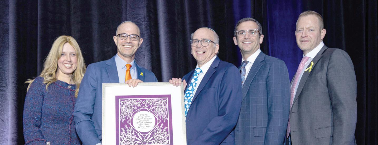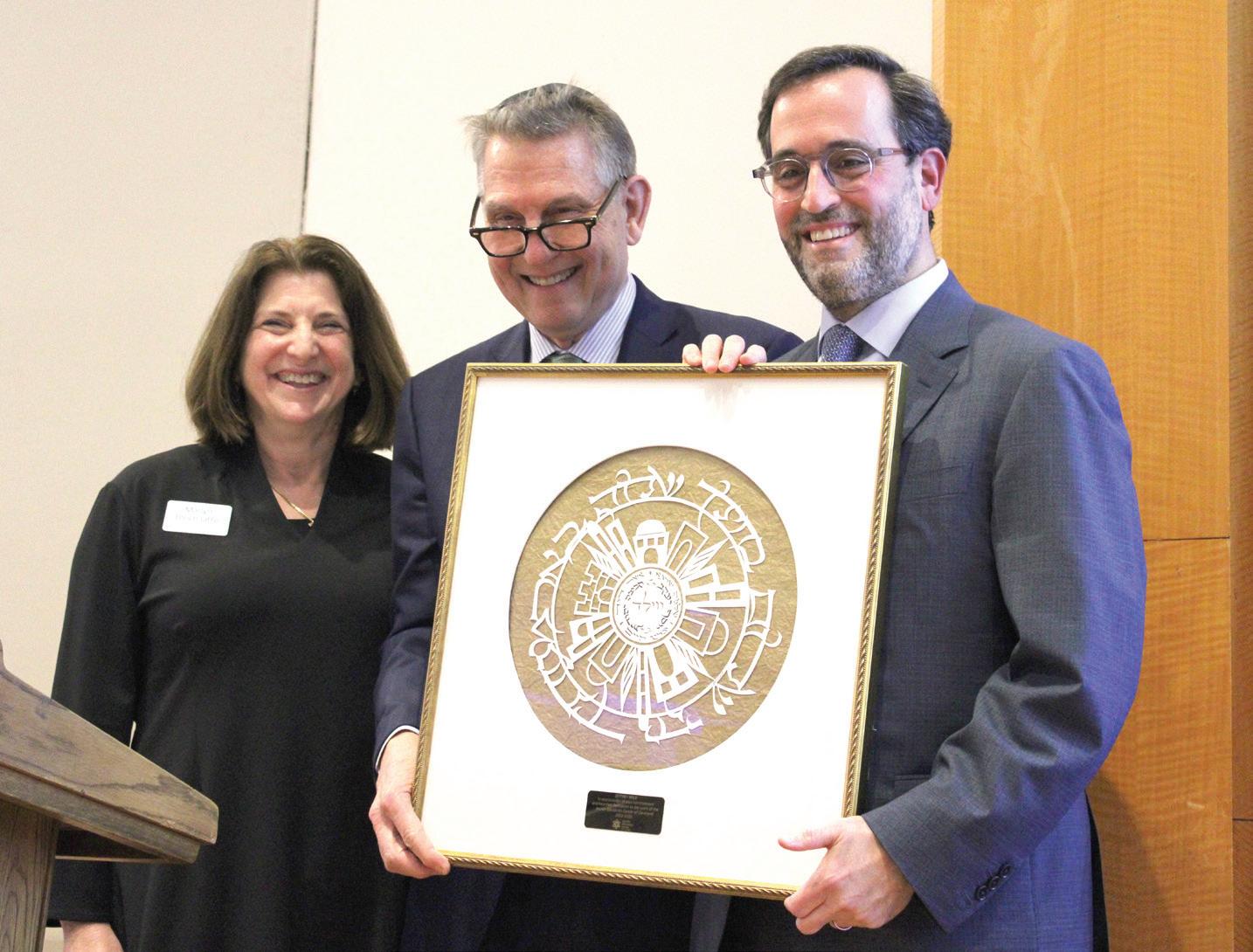 Marlyn Bloch Jaffe, CEO of the Jewish Education Center of Cleveland, and Gary Gross, honorary trustee, pay tribute to Jeffrey Wild, president of the board of trustees for the Jewish Education Center of Cleveland. | Photo / Cleveland Kesher