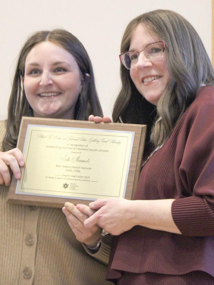 Rachel Glickman, left, chair of the awards committee, presents Estie Steinmetz, math and computer teacher at Yeshiva Derech Hatorah Girls High School in Cleveland Heights, the first of two of The RatnerGoldberg Fellowship, providing funding for study opportunities in Israel.