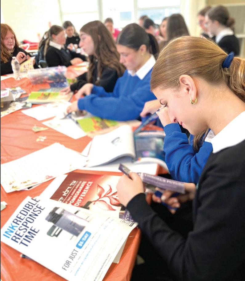 Hila Cohen, top, Malky Gutman and Daniella Kessler reflect on the day’s learning as they create inspiration boards during Chaviva’s Pesach Yom Iyun.