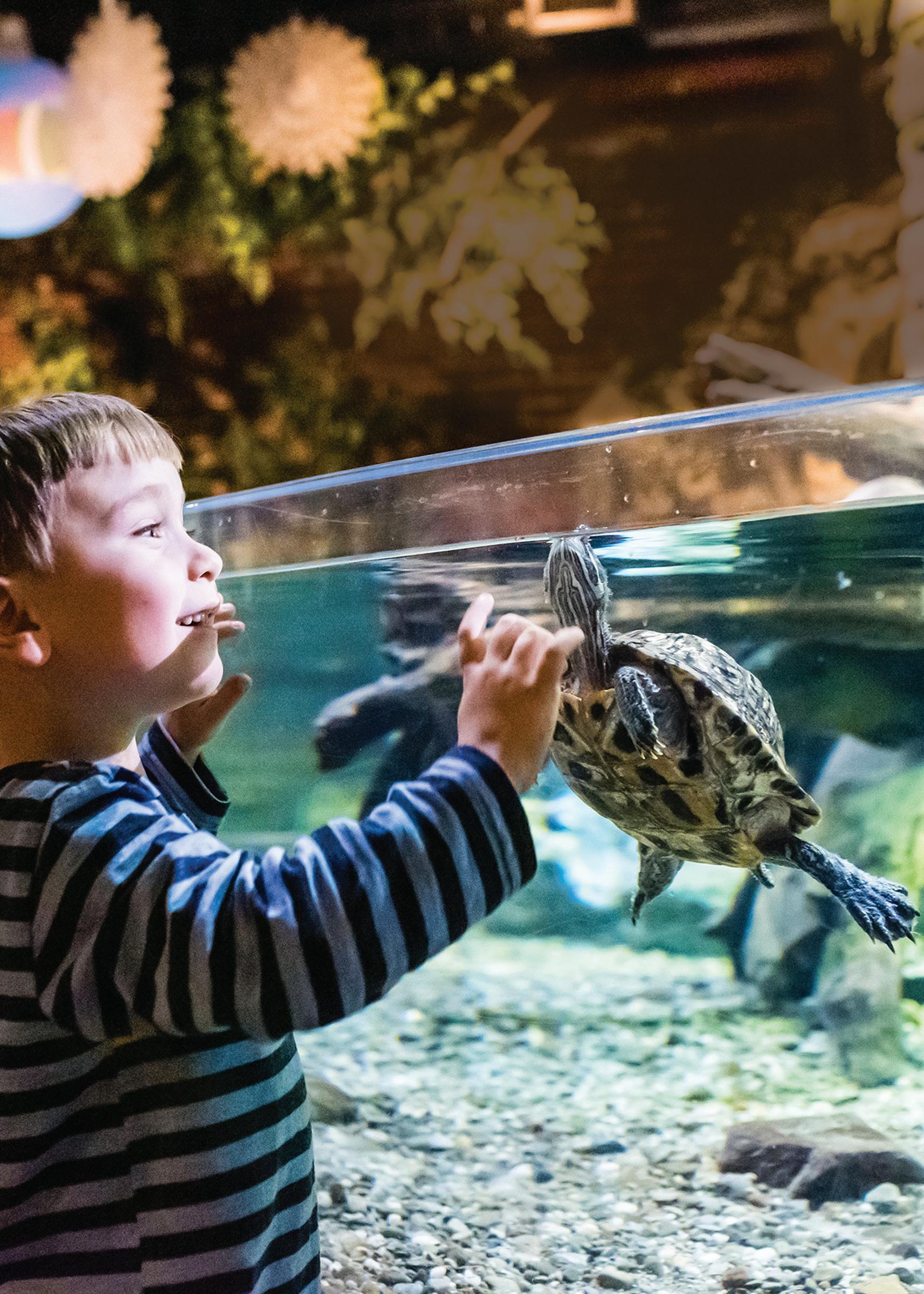 Distressed brick walls, exposed ductwork and reimagined coal chutes juxtapose Northeast Ohio’s industrial past with the aquarium’s conservation focus. The boutique aquarium has had to be creative in adapting the historic brick building to meet the needs of its guests and its residents, so many of its exhibits are freestanding and o er 180- to 360-degree views perfect for little ones.