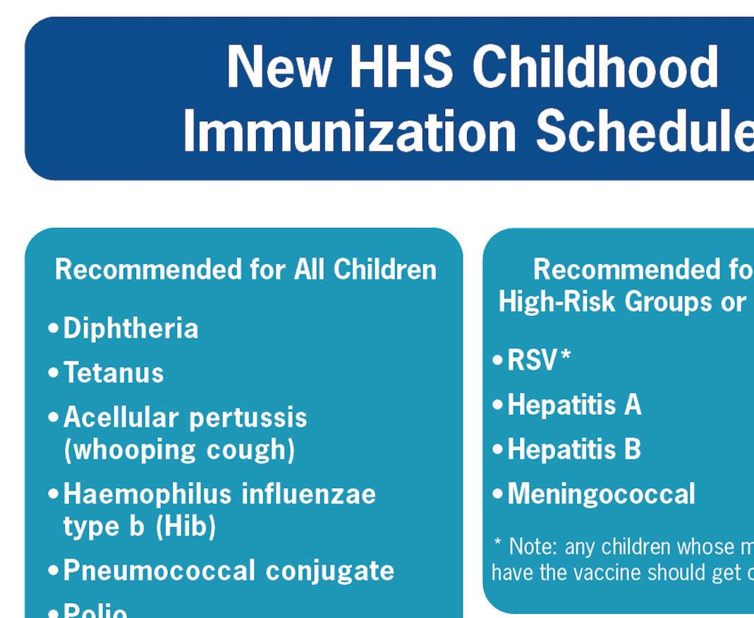 Pediatricians continue to rely on the vaccine schedule recommended by the AAP. While the CDC has changed its recommendations, all recommended vaccines remain available in pediatric o ces. According to Dr. Mehmet Oz, administrator for Centers for Medicare & Medicaid Services, all vaccines currently recommended by the CDC will remain covered by both Medicaid and private insurances. Vaccines can be spaced, however, research shows that families who follow non-standard schedules are less likely to complete the full vaccination series by the end of childhood.