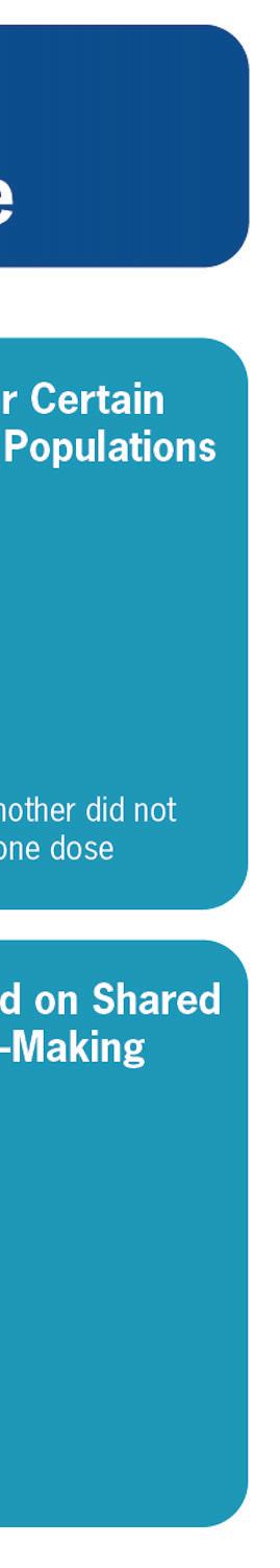 Parents and their providers want the same thing – the best possible outcomes for children. is is best achieved by having open conversations with your provider. Parents should always feel comfortable asking questions at their children’s appointments so they can feel informed and comfortable with the choices they are making regarding vaccines. “Shared clinical decision making” may be a new phrase in the vaccine guidelines but it’s something pediatricians have been doing all along.