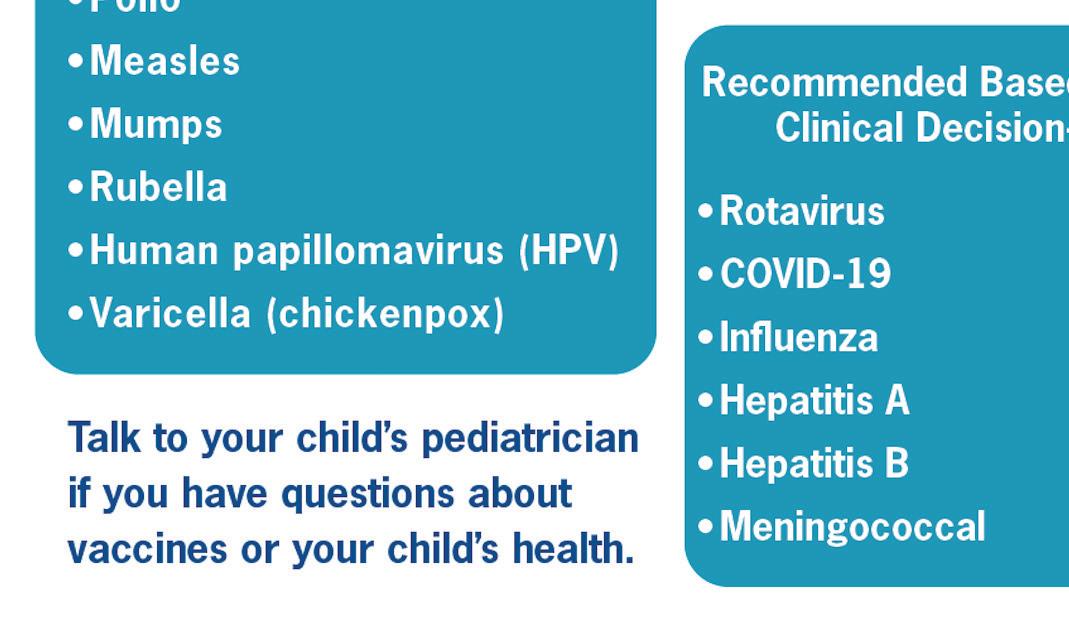 17 childhood vaccines to 11 and placed vaccine recommendations into three groups: all children, high-risk groups and populations and shared clinical decision making. ese changes are in con ict to the recommendations of the American Academy of Pediatrics and have left parents with questions that I hope to answer here.