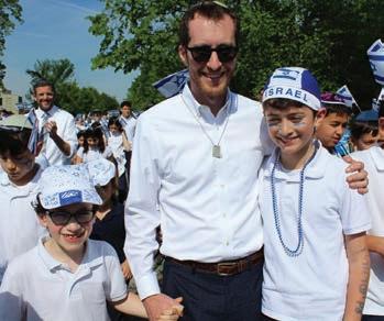 Alumni Michael Hoenig, class of 2000, joins his children and current Mizrachi students Gabriel and Isaac Hoenig at the annual Yom Ha’atzmaut parade.