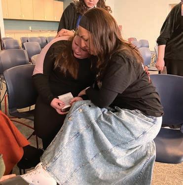 Einav Danino, mother of hostage Ori, held in Gaza since Oct. 7, 2023, and Chaviva freshman Avigayil Taub share a moment of grief and faith after Danino’s presentation to the school.
