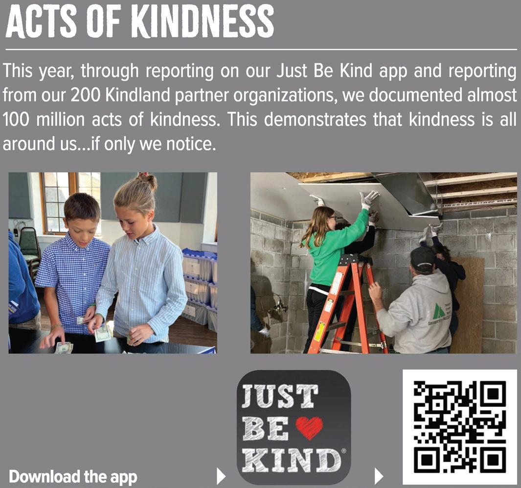 Kindland is Values-in-Action’s national movement to tip society back to person-to-person kindness. This movement is based on the premise that there are millions of acts of kindness ongoing, but we don’t notice them because they are drowned out by negativity. It takes five positive acts to offset one negative act in the consciousness of the human mind. Kindland seeks to have each of us doing or documenting the five positive acts through intentional acts of kindness every day. This can be done by using the Just Be Kind app (available on all the app stores) or by reporting acts of kindness done or witnessed by using #kindland on social media.