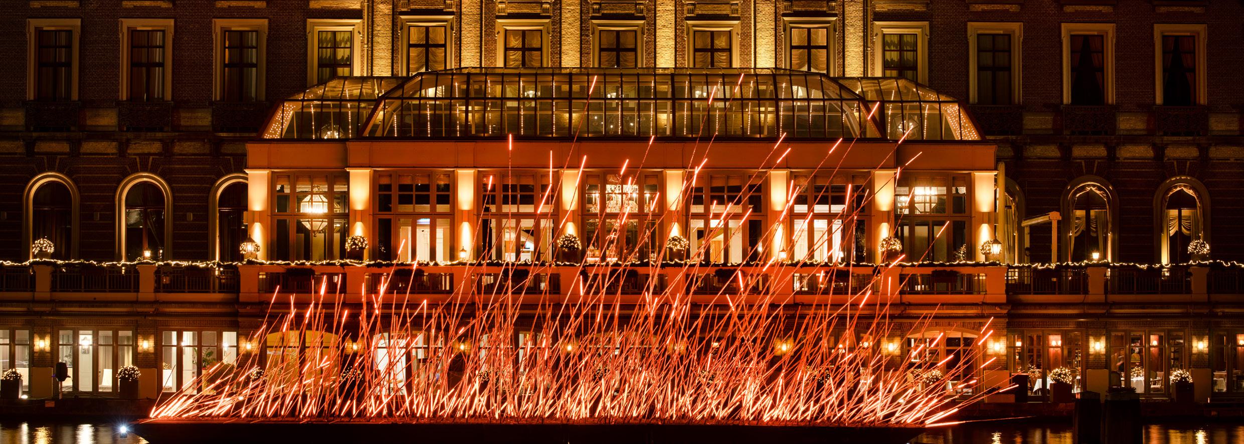 Dit kunstwerk is het waard om in het echt te zien. Ik vond dat het veel groter moest dan origineel voorgesteld. En niet op de grond, maar juist op het water. Zwevend. Zodat je het contrast van twee verschillende elementen krijgt: water en vuur. Het representeert iets nieuws en symboliseert hoop, warmte en wedergeboorte. Een perfecte match met het thema!
