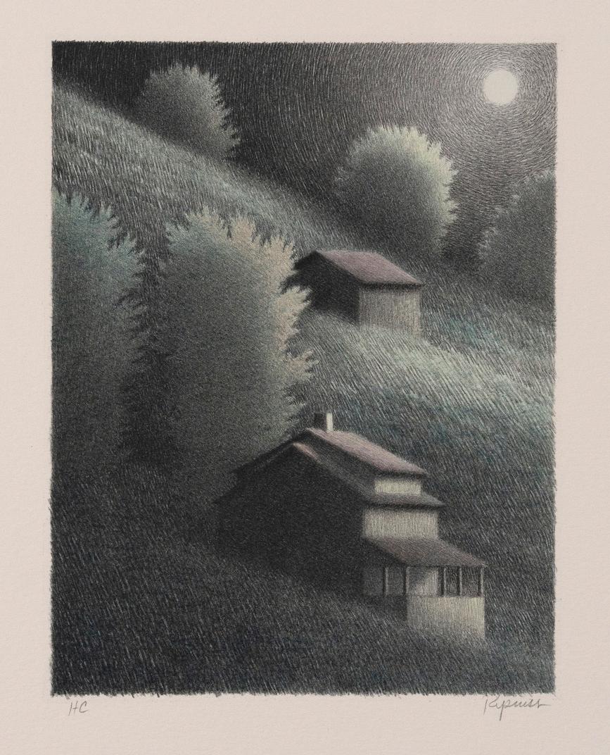 Hillside w/ porch & moon, Color lithograph, 1994