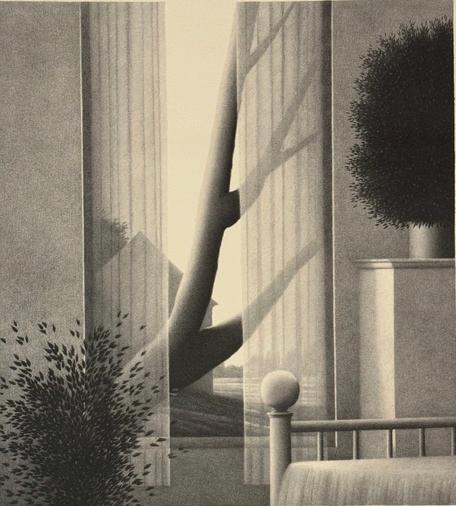 Through bedroom curtains, Lithograph, 1983